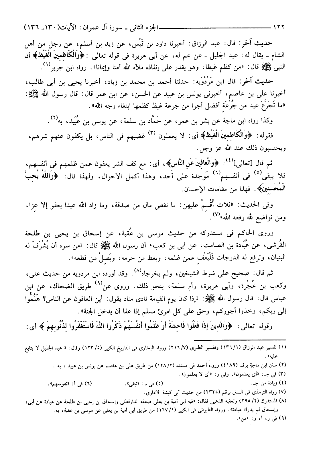 ثُمَّ قَالَ [تَعَالَى] (4) {وَالْعَافِينَ عَنِ النَّاسِ} أَيْ: مَعَ كَفِّ الشَّرِّ يَعْفُونَ عَمَّنْ ظَلَمَهُمْ فِي أَنْفُسِهِمْ، فَلَا يَبْقَى (5) فِي أَنْفُسِهِمْ (6) مَوجدة عَلَى أَحَدٍ، وَهَذَا أَكْمَلُ الْأَحْوَالِ، وَلِهَذَا قَالَ: {وَاللَّهُ يُحِبُّ الْمُحْسِنِينَ} فَهَذَا مِنْ مَقَامَاتِ الْإِحْسَانِ.