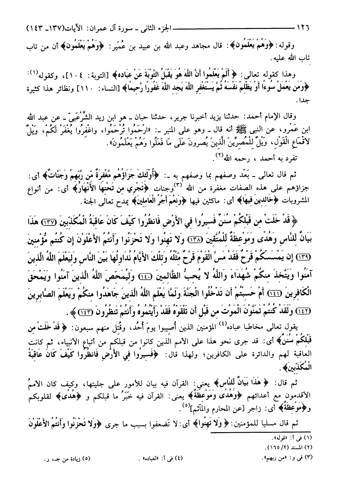 {قَدْ خَلَتْ مِنْ قَبْلِكُمْ سُنَنٌ فَسِيرُوا فِي الأرْضِ فَانْظُروا كَيْفَ كَانَ عَاقِبَةُ الْمُكَذِّبِينَ (137) هَذَا بَيَانٌ لِلنَّاسِ وَهُدًى وَمَوْعِظَةٌ لِلْمُتَّقِينَ (138) وَلا تَهِنُوا وَلا تَحْزَنُوا وَأَنْتُمُ الأعْلَوْنَ إِنْ كُنْتُمْ مُؤْمِنِينَ (139) إِنْ يَمْسَسْكُمْ قَرْحٌ فَقَدْ مَسَّ الْقَوْمَ قَرْحٌ مِثْلُهُ وَتِلْكَ الأيَّامُ نُدَاوِلُهَا بَيْنَ النَّاسِ وَلِيَعْلَمَ اللَّهُ الَّذِينَ آمَنُوا وَيَتَّخِذَ مِنْكُمْ شُهَدَاءَ وَاللَّهُ لَا يُحِبُّ الظَّالِمِينَ (140) }