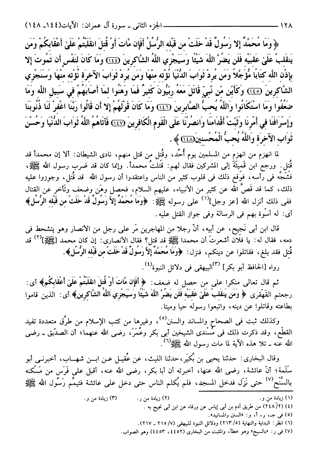 وَكَذَلِكَ ثَبَتَ فِي الصِّحَاحِ وَالْمَسَانِدِ وَالسُّنَنِ (5) وَغَيْرِهَا مِنْ كُتْبِ الْإِسْلَامِ مَنْ طُرق مُتَعَدِّدَةٍ تُفِيدُ القطْع، وَقَدْ ذَكَرْتُ ذَلِكَ فِي مُسْندي الشَّيْخَيْنِ أَبِي بَكْرٍ وعُمَرَ، رَضِيَ اللَّهُ عَنْهُمَا؛ أَنَّ الصِّدِّيقَ -رَضِيَ اللَّهُ عَنْهُ-تَلَا هَذِهِ الْآيَةَ لَمَّا مَاتَ رَسُولُ اللَّهِ صَلَّى اللَّهُ عَلَيْهِ وَسَلَّمَ (6) .