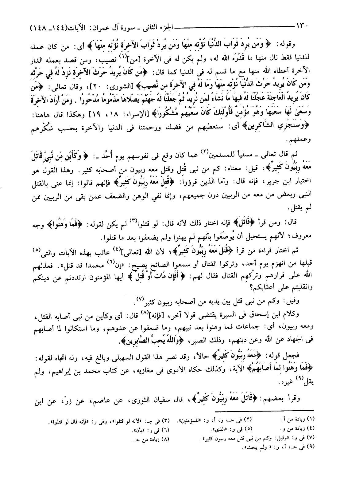 ثُمَّ قَالَ تَعَالَى -مُسَلِّيًا لِلْمُسْلِمِينَ (2) عَمَّا كَانَ وَقَعَ فِي نُفُوسِهِمْ يَوْمَ أُحُد-: {وَكَأَيِّنْ مِنْ نَبِيٍّ قَاتَلَ مَعَهُ رِبِّيُّونَ كَثِيرٌ} قِيلَ: مَعْنَاهُ: كَمْ مِنْ نَبِيٍّ قُتِل وَقُتِلَ مَعَهُ رِبِّيُّونَ مِنْ أَصْحَابِهِ كَثِيرٌ. وَهَذَا الْقَوْلُ هُوَ اخْتِيَارُ ابْنِ جَرِيرٍ، فَإِنَّهُ قَالَ: وَأَمَّا الَّذِينَ قرؤوا: {قُتِلَ مَعَهُ رِبِّيُّونَ كَثِيرٌ} فَإِنَّهُمْ قَالُوا: إِنَّمَا عَنَى بِالْقَتْلِ النَّبِيَّ وَبَعْضَ مِنْ مَعَهُ مِنَ الرِّبِّيِّينَ دُونَ جَمِيعِهِمْ، وَإِنَّمَا نَفَى الْوَهَنَ وَالضَّعْفَ عَمَّنْ بَقِيَ مِنَ الرِّبِّيِّينَ مِمَّنْ لَمْ يُقْتَلْ.
