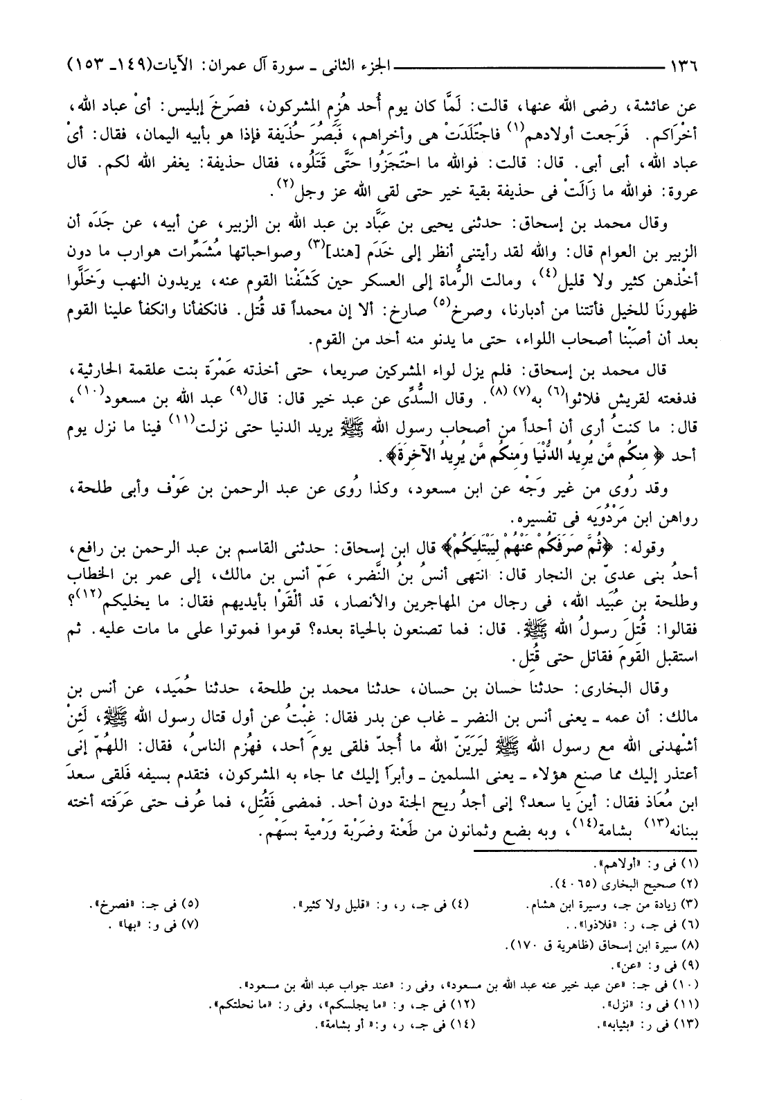 وَقَوْلُهُ: {ثُمَّ صَرَفَكُمْ عَنْهُمْ لِيَبْتَلِيَكُمْ} قَالَ ابْنُ إِسْحَاقَ: حَدَّثَنِي الْقَاسِمُ بْنُ عَبْدِ الرَّحْمَنِ بْنِ رَافِعٍ، أحدُ بَنِي عَدِيِّ بْنِ النَّجَّارِ قَالَ: انْتَهَى أنسُ بنُ النَّضر، عَمّ أَنَسِ بْنِ مَالِكٍ، إِلَى عُمَرَ بْنِ الْخَطَّابِ وَطَلْحَةَ بْنِ عُبَيد اللَّهِ، فِي رِجَالٍ مِنَ الْمُهَاجِرِينَ وَالْأَنْصَارِ، قَدْ ألْقَوْا بِأَيْدِيهِمْ فَقَالَ: مَا يُخَلِّيكُمْ (12) ؟ فَقَالُوا: قُتِلَ رسولُ اللَّهِ صَلَّى اللَّهُ عَلَيْهِ وَسَلَّمَ. قَالَ: فَمَا تَصْنَعُونَ بِالْحَيَاةِ بَعْدَهُ؟ قُومُوا فَمُوتُوا عَلَى مَا مَاتَ عَلَيْهِ. ثُمَّ اسْتَقْبَلَ القومَ فَقَاتَلَ حَتَّى قُتِل.