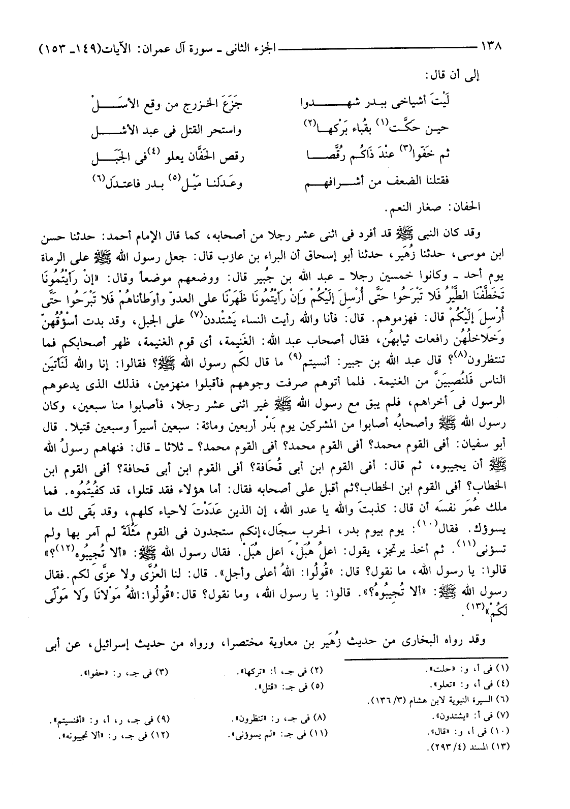 وَقَدْ كَانَ النَّبِيُّ صَلَّى اللَّهُ عَلَيْهِ وَسَلَّمَ قَدْ أُفْرِدَ فِي اثْنَيْ عَشَرَ رَجُلًا مِنْ أَصْحَابِهِ، كَمَا قَالَ الْإِمَامُ أَحْمَدُ: حَدَّثَنَا حَسَنُ بْنُ مُوسَى، حَدَّثَنَا زُهَير، حَدَّثَنَا أَبُو إِسْحَاقَ أَنَّ الْبَرَاءَ بْنَ عَازِبٍ قَالَ: جَعَلَ رَسُولُ اللَّهِ صَلَّى اللَّهُ عَلَيْهِ وَسَلَّمَ عَلَى الرُّمَاةِ يَوْمَ أُحُدٍ -وَكَانُوا خَمْسِينَ رَجُلًا-عَبْدَ اللَّهِ بْنَ جُبير قَالَ: وَوَضَعَهُمْ مَوْضِعًا وَقَالَ: "إنْ رَأَيْتُمُونَا تَخَطَّفَنَا الطَّيْرُ فَلا تَبْرَحُوا حَتَّى أُرْسِلَ إلَيْكُمْ وَإنْ رَأيْتُمُونَا ظَهَرنَا عَلَى الْعَدُوّ وأوَطأناهُمْ فَلا تَبْرَحُوا حَتَّى أُرسِلَ إلَيْكُمْ قَالَ: فَهَزَمُوهُمْ. قَالَ: فَأَنَا وَاللَّهِ رَأَيْتُ النِّسَاءَ يَشْتددن (7) عَلَى الْجَبَلِ، وَقَدْ بَدَتْ أسْؤُقُهنّ وخَلاخلُهُن رَافِعَاتٌ ثيابهُن، فَقَالَ أَصْحَابُ عَبْدِ اللَّهِ: الغَنِيمة، أَيْ قَوْمُ الْغَنِيمَةَ، ظَهَرَ أَصْحَابُكُمْ فَمَا تَنْتَظِرُونَ (8) ؟ قَالَ عَبْدُ اللَّهِ بْنُ جُبَيْرٍ: أَنَسِيتُمْ (9) مَا قَالَ لَكُمْ رَسُولَ اللَّهِ صَلَّى اللَّهُ عَلَيْهِ وَسَلَّمَ؟ فَقَالُوا: إنا والله لَنَأتيَن الناس فَلنُصِبيَنَّ مِنَ الْغَنِيمَةِ. فَلَمَّا أَتَوْهُمْ صُرِفَتْ وُجُوهُهُمْ فَأَقْبَلُوا مُنْهَزِمِينَ، فَذَلِكَ الَّذِي يَدْعُوهُمُ الرَّسُولُ فِي أُخْرَاهُمْ، فَلَمْ يَبْقَ مَعَ رَسُولِ اللَّهِ صَلَّى اللَّهُ عَلَيْهِ وَسَلَّمَ غَيْرُ اثْنَيْ عَشَرَ رَجُلًا فَأَصَابُوا مِنَّا سَبْعِينَ، وَكَانَ رَسُولُ اللَّهِ صَلَّى اللَّهُ عَلَيْهِ وَسَلَّمَ وأصحابُه أَصَابُوا مِنَ الْمُشْرِكِينَ يَوْمَ بَدْر أَرْبَعِينَ وَمِائَةً: سَبْعِينَ أَسِيرًا وَسَبْعِينَ قَتِيلًا. قَالَ أَبُو سُفْيَانَ: أَفِي الْقَوْمِ مُحَمَّدٌ؟ أَفِي الْقَوْمِ مُحَمَّدٌ؟ أَفِي الْقَوْمِ مُحَمَّدٌ؟ -ثَلَاثًا -قَالَ: فَنَهَاهُمْ رسولُ اللَّهِ صَلَّى اللَّهُ عَلَيْهِ وَسَلَّمَ أَنْ يُجِيبُوهُ، ثُمَّ قَالَ: أَفِي الْقَوْمِ ابْنُ أَبِي قُحَافة؟ أَفِي الْقَوْمِ ابْنُ أَبِي قُحَافَةَ؟ أَفِي الْقَوْمِ ابْنُ الْخَطَّابِ؟ أَفِي الْقَوْمِ ابْنُ الْخَطَّابِ؟ ثُمَّ أَقْبَلَ عَلَى أَصْحَابِهِ فَقَالَ: أَمَّا هَؤُلَاءِ فَقَدْ قُتِلُوا، قَدْ كُفيتُمُوه. فَمَا مَلَكَ عُمَر نفسَه أَنْ قَالَ: كذبتَ وَاللَّهِ يَا عَدُوَّ اللَّهِ، إِنَّ الَّذِينَ عَدَدْتَ لِأَحْيَاءٌ كُلُّهُمْ، وقد بَقى لك ما يسوؤك. فَقَالَ (10) يَوْمٌ بِيَوْمِ بَدْرٍ، وَالْحَرْبُ سِجَال، إِنَّكُمْ سَتَجِدُونَ فِي الْقَوْمِ مَثُلَةً لَمْ آمُرْ بِهَا وَلَمْ تَسُؤْنِي (11) ثُمَّ أَخَذَ يَرْتَجِزُ، يَقُولُ: اعلُ هُبَلْ. اعْلُ هُبَلْ. فَقَالَ رَسُولُ اللَّهِ صَلَّى اللَّهُ عَلَيْهِ وَسَلَّمَ: "أَلَا تُجِيبُوه (12) ؟ " قَالُوا: يَا رَسُولَ اللَّهِ، مَا نَقُولُ؟ قَالَ: "قُولُوا: اللَّهُ أَعْلَى وَأَجَلُّ". قَالَ: لَنَا العُزَّى وَلَا عزَّى لَكُمْ. فَقَالَ رَسُولُ اللَّهِ صَلَّى اللَّهُ عَلَيْهِ وَسَلَّمَ: "أَلَا تُجِيبُوهُ؟ ". قَالُوا: يَا رَسُولَ اللَّهِ، وَمَا نَقُولُ؟ قَالَ: "قُولُوا: اللهُ مَوْلانَا وَلا مَوْلَى لَكُمْ" (13) .