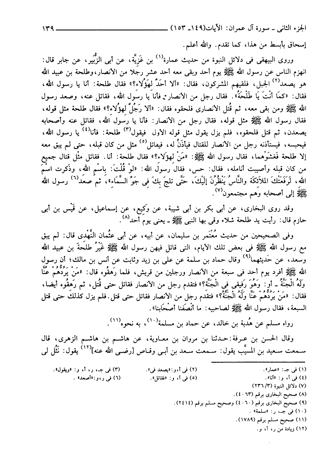 وَرَوَى الْبَيْهَقِيُّ فِي دَلَائِلِ النُّبُوَّةِ مِنْ حَدِيثِ عُمَارَةَ (1) بْنِ غَزِيَّة، عَنْ أَبِي الزُّبَير، عَنْ جَابِرٍ قَالَ: انْهَزَمَ النَّاسُ عَنْ رَسُولِ اللَّهِ صَلَّى اللَّهُ عَلَيْهِ وَسَلَّمَ يَوْمَ أُحُدٍ وَبَقِيَ مَعَهُ أَحَدَ عَشَرَ رَجُلًا مِنَ الْأَنْصَارِ، وَطَلْحَةُ بْنُ عُبَيْدِ اللَّهِ وَهُوَ يَصْعَدُ (2) الْجَبَلَ، فَلَقِيَهُمُ الْمُشْرِكُونَ، فَقَالَ: "أَلَا أحَدٌ لِهَؤُلاءِ؟ " فَقَالَ طَلْحَةُ: أَنَا يَا رَسُولَ اللَّهِ، فَقَالَ: "كمَا أنْتَ يَا طَلْحَةُ". فَقَالَ رَجُلٌ مِنَ الْأَنْصَارِ: فَأَنَا يَا رَسُولَ اللَّهِ، فَقَاتَلَ عَنْهُ، وَصَعِدَ رَسُولُ اللَّهِ صَلَّى اللَّهُ عَلَيْهِ وَسَلَّمَ وَمَنْ بَقِيَ مَعَهُ، ثُمَّ قُتل الْأَنْصَارِيُّ فَلَحِقُوهُ فَقَالَ: "أَلَا رجُلٌ لِهؤُلاءِ؟ " فَقَالَ طَلْحَةُ مِثْلَ قَوْلِهِ، فَقَالَ رَسُولُ اللَّهِ صَلَّى اللَّهُ عَلَيْهِ وَسَلَّمَ مِثْلَ قَوْلِهِ، فَقَالَ رَجُلٌ مِنَ الْأَنْصَارِ: فَأَنَا يَا رَسُولَ اللَّهِ، فَقَاتَلَ عَنْهُ وَأَصْحَابُهُ يَصْعَدْنَ، ثُمَّ قُتِلَ فَلَحِقُوهُ، فَلَمْ يَزَلْ يَقُولُ مِثْلَ قَوْلِهِ الْأَوَّلِ فَيَقُولُ (3) طَلْحَةُ: فَأَنَا (4) يَا رَسُولَ اللَّهِ، فَيَحْبِسُهُ، فَيَسْتَأْذِنُهُ رَجُلٌ مِنَ الْأَنْصَارِ لِلْقِتَالِ فيأذَنُ لَهُ، فَيُقَاتِلُ (5) مِثْلَ مَنْ كَانَ قَبْلَهُ، حَتَّى لَمْ يَبْقَ مَعَهُ إِلَّا طَلْحَةُ فَغشَوْهما، فَقَالَ رَسُولُ اللَّهِ صَلَّى اللَّهُ عَلَيْهِ وَسَلَّمَ: "مَنْ لِهَؤلاءِ؟ " فَقَالَ طَلْحَةُ: أَنَا. فَقَاتَلَ مثْل قِتَالِ جَمِيعِ مَنْ كَانَ قَبْلَهُ وَأُصِيبَتْ أَنَامِلُهُ، فَقَالَ: حَسِّ، فَقَالَ رَسُولُ اللَّهِ: "لوْ قُلْتَ: بِاسْمِ اللهِ، وذَكرت اسْمَ اللَّهِ، لَرَفَعَتْكَ الملائِكَة والنَّاسُ يَنْظُرونَ إلَيْكَ، حَتَّى تلجَ بِكَ فِي جَوِّ السَّمَاءِ"، ثُمَّ صَعِدَ (6) رَسُولُ اللَّهِ صَلَّى اللَّهُ عَلَيْهِ وَسَلَّمَ إِلَى أَصْحَابِهِ وَهُمْ مُجْتَمِعُونَ (7) .