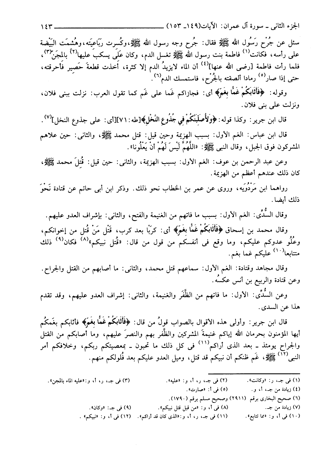 قَالَ ابْنُ جَرِيرٍ: وَأَوْلَى هَذِهِ الْأَقْوَالِ بِالصَّوَابِ قولُ مَنْ قَالَ: {فَأَثَابَكُمْ غَمًّا بِغَمٍّ} فَأَثَابَكُمْ بغَمكُم أَيُّهَا الْمُؤْمِنُونَ بِحِرْمَانِ اللَّهِ إِيَّاكُمْ غنيمةَ الْمُشْرِكِينَ والظَّفر بِهِمْ والنصرَ عَلَيْهِمْ، وَمَا أَصَابَكُمْ مِنَ الْقَتْلِ وَالْجِرَاحِ يَوْمَئِذٍ -بَعْدَ الَّذِي أَرَاكُمْ (11) فِي كُلِّ ذَلِكَ مَا تُحِبُّونَ -بِمَعْصِيَتِكُمْ رَبَّكُمْ، وَخِلَافِكُمْ أَمْرَ النَّبِيِّ (12) صَلَّى اللَّهُ عَلَيْهِ وَسَلَّمَ، غَم ظَنِّكُمْ أَنَّ نَبِيَّكُمْ قَدْ قُتِلَ، وَمَيْلِ العدو عليكم بعد فُلولكم منهم.