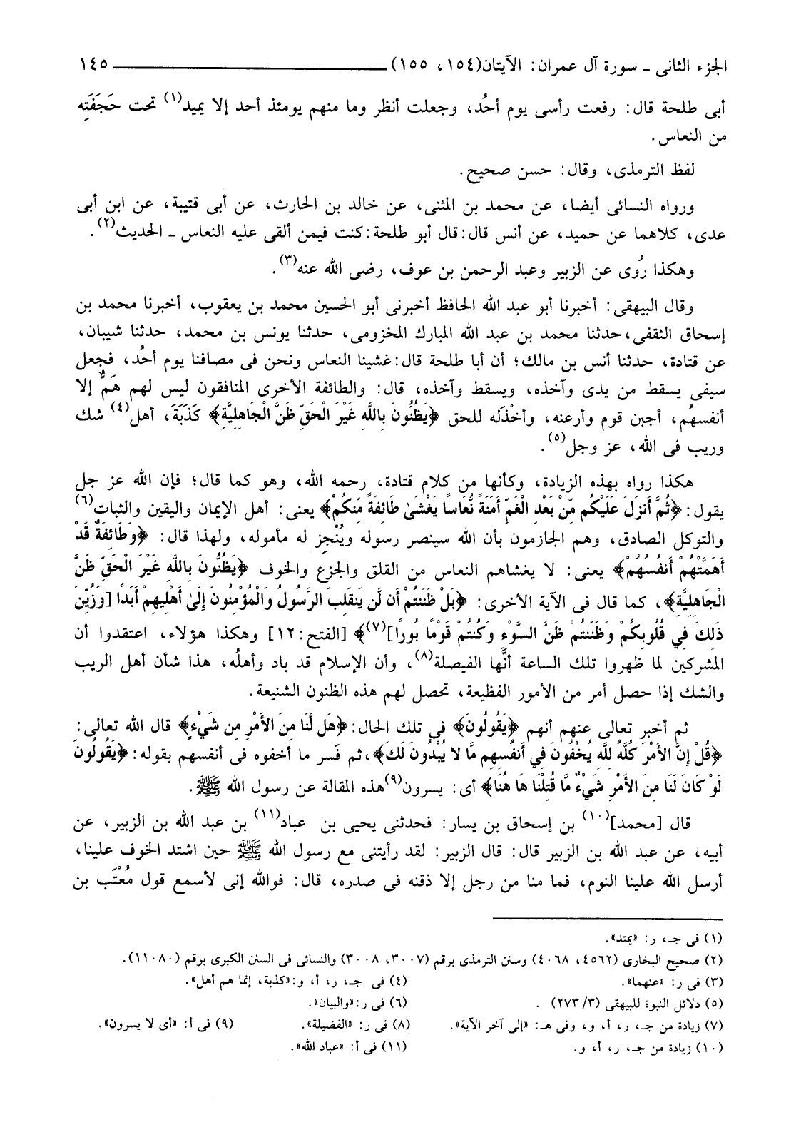 هَكَذَا رَوَاهُ بِهَذِهِ الزِّيَادَةِ، وَكَأَنَّهَا مِنْ كَلَامِ قَتَادَةَ، رَحِمَهُ اللَّهُ، وَهُوَ كَمَا قَالَ؛ فَإِنَّ اللَّهَ عَزَّ وَجَلَّ يَقُولُ: {ثُمَّ أَنزلَ عَلَيْكُمْ مِنْ بَعْدِ الْغَمِّ أَمَنَةً نُعَاسًا يَغْشَى طَائِفَةً مِنْكُمْ} يَعْنِي: أَهْلَ الْإِيمَانِ وَالْيَقِينِ وَالثَّبَاتِ (6) وَالتَّوَكُّلِ الصَّادِقِ، وَهُمُ الْجَازِمُونَ بِأَنَّ اللَّهَ سَيَنْصُرُ رَسُولَهُ ويُنْجِز لَهُ مَأْمُولَهُ، وَلِهَذَا قَالَ: {وَطَائِفَةٌ قَدْ أَهَمَّتْهُمْ أَنْفُسُهُمْ} يَعْنِي: لَا يَغْشَاهُمُ النُّعَاسُ مِنَ الْقَلَقِ وَالْجَزَعِ وَالْخَوْفِ {يَظُنُّونَ بِاللَّهِ غَيْرَ الْحَقِّ ظَنَّ الْجَاهِلِيَّةِ} كَمَا قَالَ فِي الْآيَةِ الْأُخْرَى: {بَلْ ظَنَنْتُمْ أَنْ لَنْ يَنْقَلِبَ الرَّسُولُ وَالْمُؤْمِنُونَ إِلَى أَهْلِيهِمْ أَبَدًا [وَزُيِّنَ ذَلِكَ فِي قُلُوبِكُمْ وَظَنَنْتُمْ ظَنَّ السَّوْءِ وَكُنْتُمْ قَوْمًا بُورًا] (7) } [الْفَتْحِ:12] وَهَكَذَا هَؤُلَاءِ، اعْتَقَدُوا أَنَّ الْمُشْرِكِينَ لَمَّا ظَهَرُوا تِلْكَ السَّاعَةِ أنَّها الْفَيْصَلَةُ (8) وَأَنَّ الْإِسْلَامَ قَدْ بَادَ وأهلُه، هَذَا شَأْنُ أَهْلِ الرَّيْبِ وَالشَّكِّ إِذَا حَصَلَ أَمْرٌ مِنَ الْأُمُورِ الْفَظِيعَةِ، تَحْصُلُ لَهُمْ هَذِهِ الظُّنُونُ الشَّنِيعَةُ.