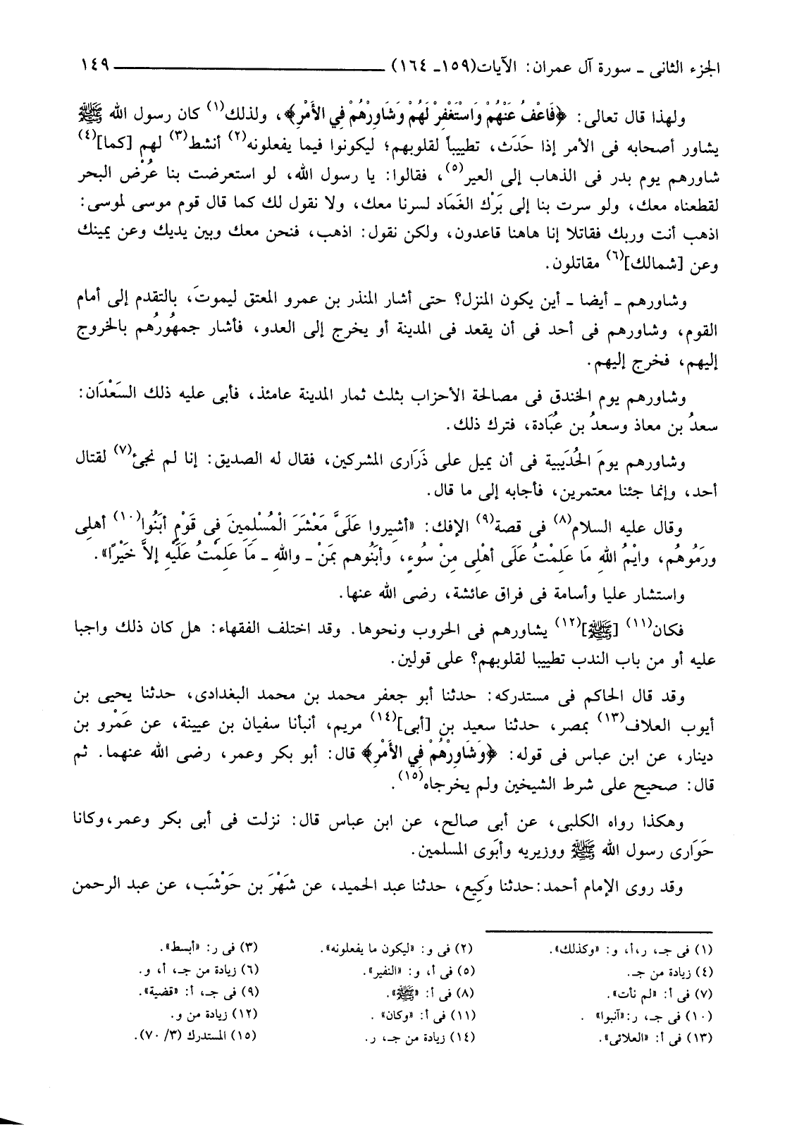 وَلِهَذَا قَالَ تَعَالَى: {فَاعْفُ عَنْهُمْ وَاسْتَغْفِرْ لَهُمْ وَشَاوِرْهُمْ فِي الأمْرِ} وَلِذَلِكَ (1) كَانَ رَسُولُ اللَّهِ صَلَّى اللَّهُ عَلَيْهِ وَسَلَّمَ يُشَاوِرُ أَصْحَابَهُ فِي الْأَمْرِ إِذَا حَدَث، تَطْيِيبًا لِقُلُوبِهِمْ؛ لِيَكُونُوا فِيمَا يَفْعَلُونَهُ (2) أَنْشَطَ (3) لَهُمْ [كَمَا] (4) شَاوَرَهُمْ يَوْمَ بَدْرٍ فِي الذَّهَابِ إِلَى الْعِيرِ (5) فَقَالُوا: يَا رَسُولَ اللَّهِ، لَوِ اسْتَعْرَضْتَ بِنَا عُرْض الْبَحْرِ لَقَطَعْنَاهُ مَعَكَ، وَلَوْ سِرْتَ بِنَا إِلَى بَرْك الغَمَاد لِسِرْنَا مَعَكَ، وَلَا نَقُولُ لَكَ كَمَا قَالَ قَوْمُ مُوسَى لِمُوسَى: اذْهَبْ أَنْتَ وَرَبُّكَ فَقَاتِلَا إِنَّا هَاهُنَا قَاعِدُونَ، وَلَكِنْ نَقُولُ: اذْهَبْ، فَنَحْنُ مَعَكَ وَبَيْنَ يَدَيْكَ وَعَنْ يَمِينِكَ وَعَنْ [شِمَالِكَ] (6) مُقَاتِلُونَ.