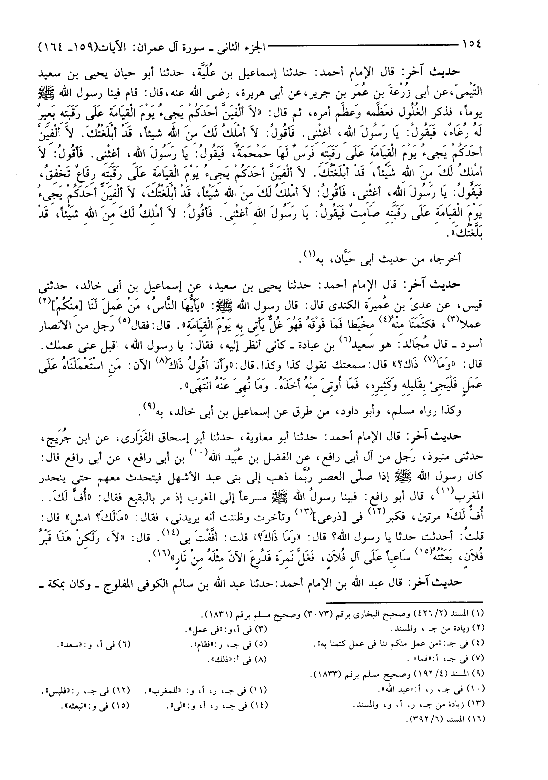 حَدِيثٌ آخَرُ: قَالَ الْإِمَامُ أَحْمَدُ: حَدَّثَنَا إِسْمَاعِيلُ بن عُلَيَّة، حَدَّثَنَا أَبُو حَيَّانَ يَحْيَى بْنُ سَعِيدٍ التّيْميّ، عَنْ أَبِي زُرْعَة بْنِ عُمَر بْنِ جَرِيرٍ، عَنْ أَبِي هُرَيْرَةَ، قَالَ: قَامَ فِينَا رَسُولُ اللَّهِ صَلَّى اللَّهُ عَلَيْهِ وَسَلَّمَ يَوْمًا، فَذَكَرَ الغُلُول فعَظَّمه وعَظَّم أَمْرَهُ، ثُمَّ قَالَ: "لا أُلْفِيَنَّ أَحَدُكُمْ يَجِيءُ يَوْمَ الْقِيَامَةِ عَلَى رَقَبَتِهِ بَعِيرٌ لَهُ رُغَاءٌ، فَيَقُولُ: يَا رَسُولَ اللَّهِ، أَغِثْنِي. فَأَقُولُ: لَا أَمْلِكُ لَكَ مِنَ اللهِ شَيْئًا، قَدْ أَبْلَغْتُكَ. لا أُلْفِيَنَّ أَحَدَكُمْ يَجِيءُ يَوْمَ الْقِيَامَةِ عَلَى رَقَبَتِهِ فَرَسٌ لَهُ حَمْحَمَةٌ، فَيَقُولُ: يَا رَسُولَ اللَّهِ، أَغِثْنِي. فَأَقُولُ: لَا أَمْلِكُ لَكَ مِنَ اللهِ شَيْئًا، قَدْ أَبْلَغْتُكَ. لا أُلْفِيَنَّ أَحَدُكُمْ يَجِيءُ يَوْمَ الْقِيَامَةِ عَلَى رَقَبَتِهِ رِقَاعٌ تَخْفِقُ، فَيَقُولُ: يَا رَسُولَ اللَّهِ، أَغِثْنِي، فَأَقُولُ: لَا أَمْلِكُ لَكَ مِنَ اللهِ شَيْئًا، قَدْ أَبْلَغْتُكَ، لا أُلْفِيَنَّ أَحَدُكُمْ يَجِيءُ يَوْمَ الْقِيَامَةِ عَلَى رَقَبَتِهِ صَامِتٌ فَيَقُولُ: يَا رَسُولَ اللَّهِ أَغِثْنِي. فَأَقُولُ: لَا أَمْلِكُ لَكَ مِنَ اللهِ شَيْئًا، قَدْ بَلَّغْتُكَ".
