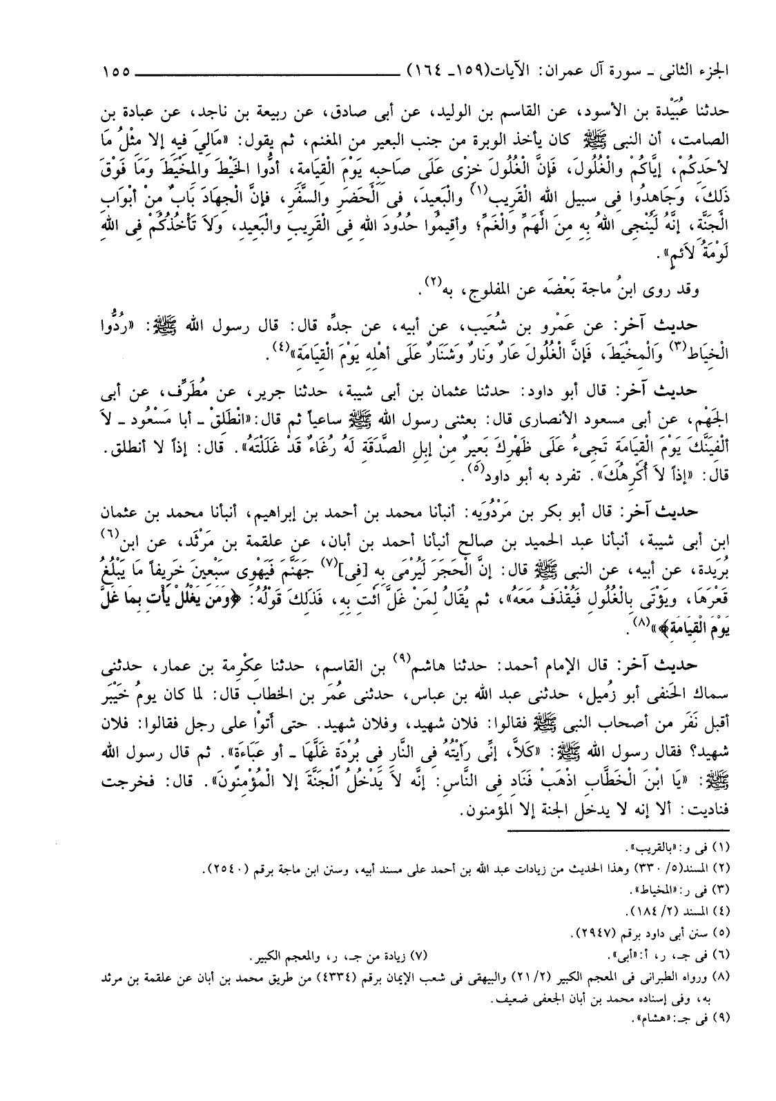 (2) المسند (5/330) وهذا الحديث من زيادات عبد الله بن أحمد على مسند أبيه، وسنن ابن ماجة برقم (2540) .