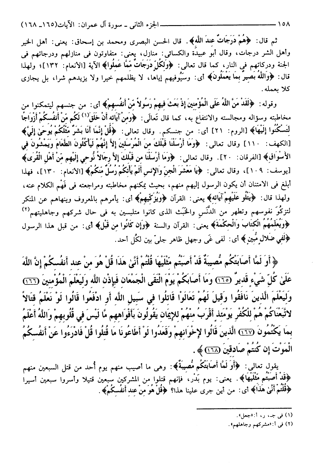 ثُمَّ قَالَ: {هُمْ دَرَجَاتٌ عِنْدَ اللَّهِ} قَالَ الْحَسَنُ الْبَصْرِيُّ وَمُحَمَّدُ بْنُ إِسْحَاقَ: يَعْنِي: أَهْلُ الْخَيْرِ وَأَهْلُ الشَّرِّ دَرَجَاتٌ، وَقَالَ أَبُو عبيدةَ وَالْكِسَائِيُّ: مَنَازِلُ، يَعْنِي: مُتَفَاوِتُونَ فِي مَنَازِلِهِمْ وَدَرَجَاتِهِمْ فِي الْجَنَّةِ وَدَرَكَاتِهِمْ فِي النَّارِ، كَمَا قَالَ تَعَالَى: {وَلِكُلٍّ دَرَجَاتٌ مِمَّا عَمِلُوا} الْآيَةَ [الْأَنْعَامِ:132] ؛ وَلِهَذَا قَالَ: {وَاللَّهُ بَصِيرٌ بِمَا يَعْمَلُونَ} أَيْ: وسَيُوفيهم إِيَّاهَا، لَا يَظْلِمُهُمْ خَيْرًا وَلَا يَزِيدُهُمْ شَرًّا، بَلْ يُجَازِي كُلًّا بِعَمَلِهِ.