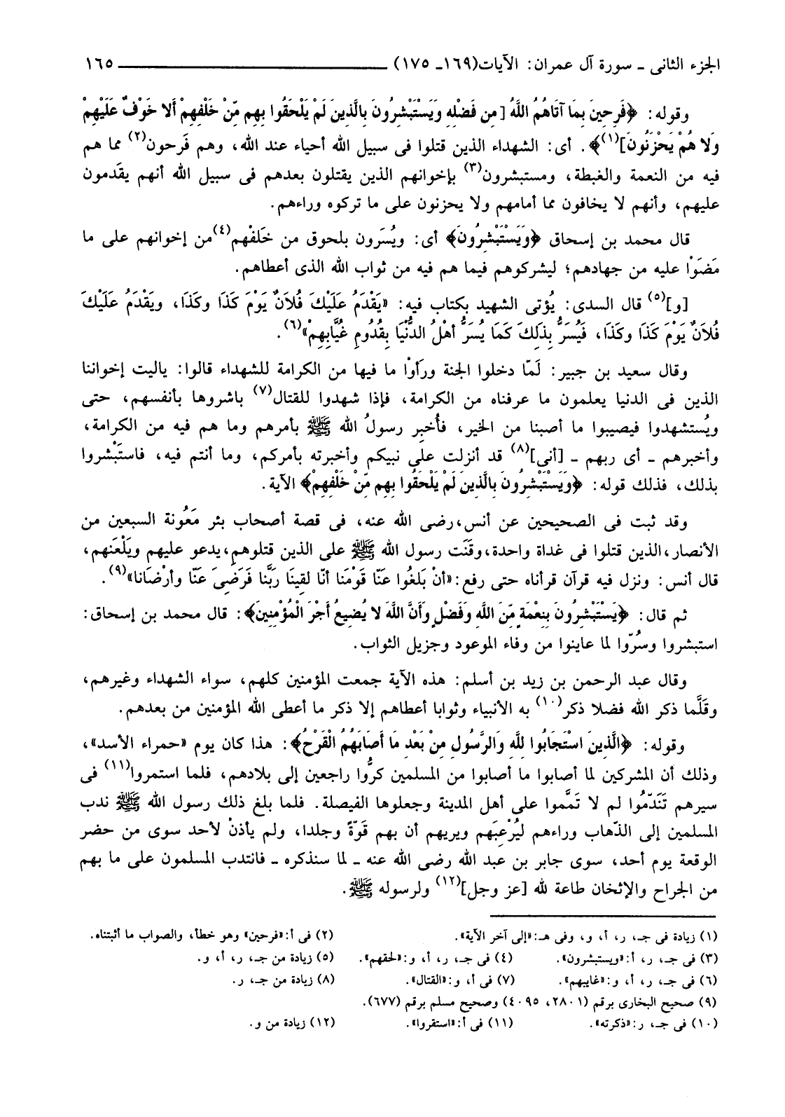 ثُمَّ قَالَ: {يَسْتَبْشِرُونَ بِنِعْمَةٍ مِنَ اللَّهِ وَفَضْلٍ وَأَنَّ اللَّهَ لَا يُضِيعُ أَجْرَ الْمُؤْمِنِينَ} قَالَ مُحَمَّدُ بْنُ إِسْحَاقَ: اسْتَبْشَرُوا وسُرّوا لِمَا عَايَنُوا مِنْ وَفَاءِ الْمَوْعُودِ وَجَزِيلِ الثَّوَابِ.