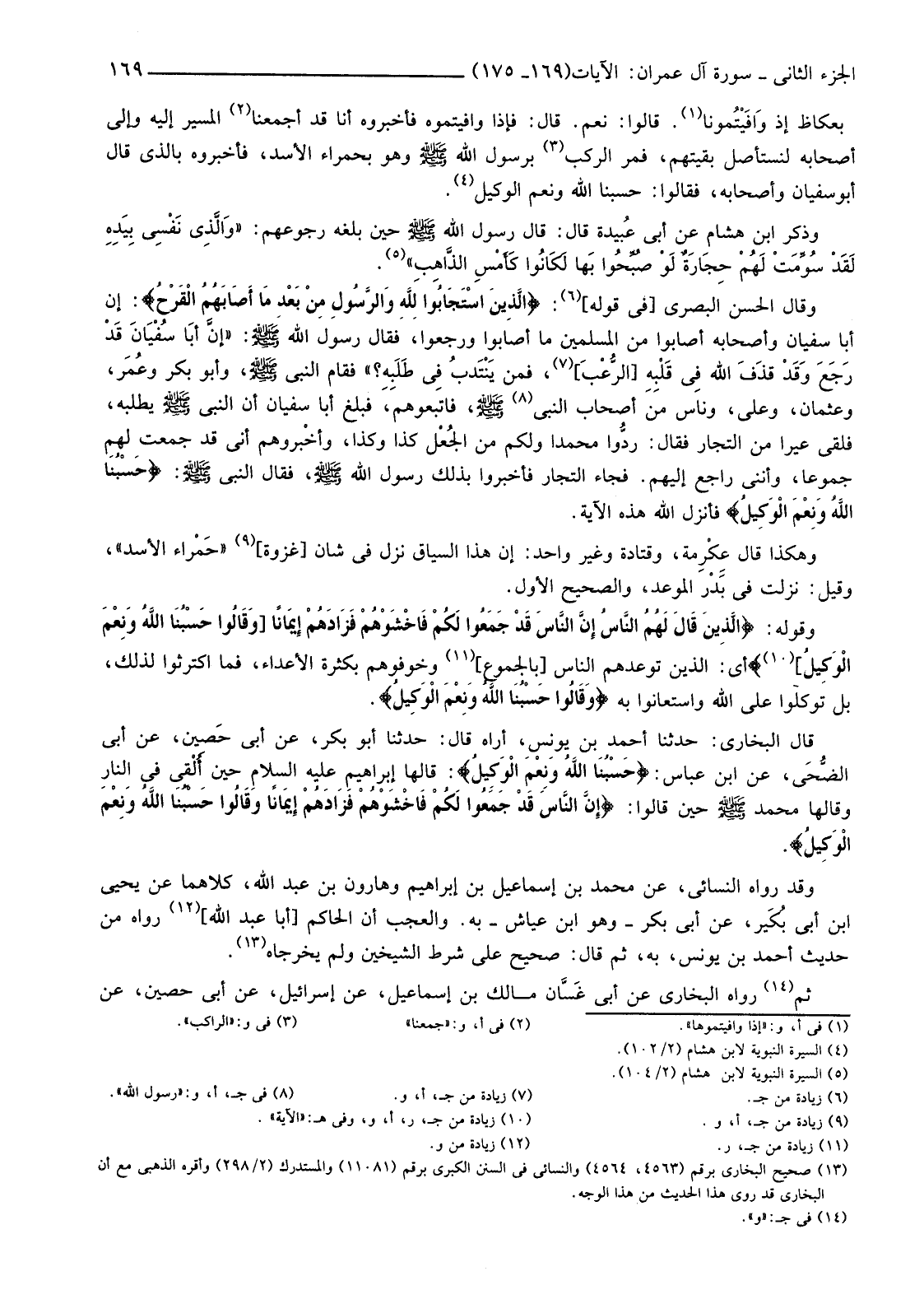 وَقَالَ الْحَسَنُ الْبَصْرِيُّ [فِي قَوْلِهِ] (6) {الَّذِينَ اسْتَجَابُوا لِلَّهِ وَالرَّسُولِ مِنْ بَعْدِ مَا أَصَابَهُمُ الْقَرْحُ} إِنَّ أَبَا سفيِان وَأَصْحَابَهُ أَصَابُوا مِنَ الْمُسْلِمِينَ مَا أَصَابُوا وَرَجَعُوا، فَقَالَ رَسُولُ اللَّهِ صَلَّى اللَّهُ عَلَيْهِ وَسَلَّمَ: "إنَّ أبَا سُفْيَانَ قَدْ رَجَعَ وَقَدْ قَذَفَ اللهُ فِي قَلْبِهِ [الرُّعْبَ] (7) فَمَنْ يَنْتَدبُ فِي طَلَبِهِ؟ " فَقَامَ النَّبِيُّ صَلَّى اللَّهُ عَلَيْهِ وَسَلَّمَ، وَأَبُو بَكْرٍ وعُمَر، وَعُثْمَانُ، وَعَلِيٌّ، وَنَاسٌ مِنْ أَصْحَابِ النَّبِيِّ (8) صَلَّى اللَّهُ عَلَيْهِ وَسَلَّمَ، فَاتَّبَعُوهُمْ، فَبَلَغَ أَبَا سُفْيَانَ أَنَّ النَّبِيَّ صَلَّى اللَّهُ عَلَيْهِ وَسَلَّمَ، يَطْلُبُهُ فَلَقِيَ عِيرًا مِنَ التُّجَّارِ فَقَالَ: ردُّوا مُحَمَّدًا وَلَكَمْ مِنَ الجُعْل كَذَا وَكَذَا، وأخْبروهم أَنِّي قَدْ جَمَعْتُ لَهُمْ جُمُوعًا، وَأَنَّنِي رَاجِعٌ إِلَيْهِمْ. فَجَاءَ التُّجَّارُ فَأَخْبَرُوا بِذَلِكَ رَسُولَ اللَّهِ صَلَّى اللَّهُ عَلَيْهِ وَسَلَّمَ، فَقَالَ النَّبِيُّ صَلَّى اللَّهُ عَلَيْهِ وَسَلَّمَ: {حَسْبُنَا اللَّهُ وَنِعْمَ الْوَكِيلُ} فَأَنْزَلَ اللَّهُ هَذِهِ الْآيَةَ.