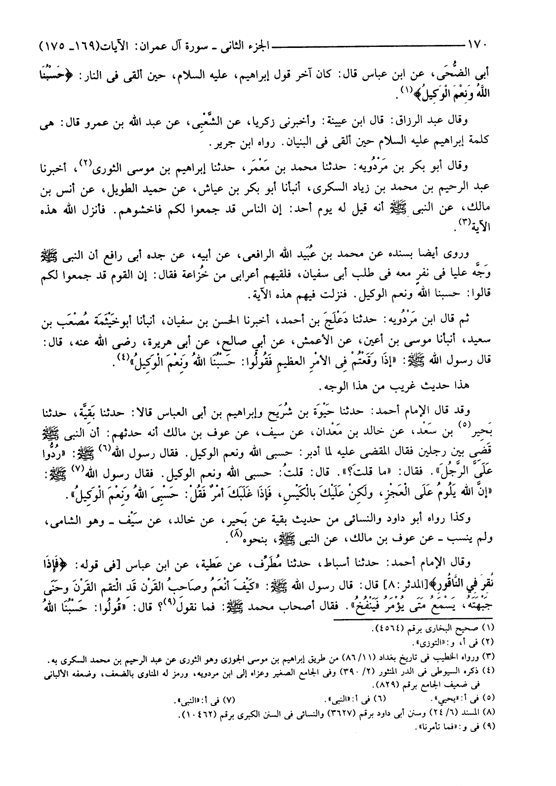 وَقَالَ عَبْدُ الرَّزَّاقِ: قَالَ ابْنُ عُيَيْنَةَ: وَأَخْبَرَنِي زَكَرِيَّا، عَنِ الشَّعْبِي، عَنْ عَبْدِ اللَّهِ بْنِ عَمْرٍو قَالَ: هِيَ كَلِمَةُ إِبْرَاهِيمَ عَلَيْهِ السَّلَامُ حِينَ أُلْقِيَ فِي الْبُنْيَانِ. رَوَاهُ ابْنُ جَرِيرٍ.