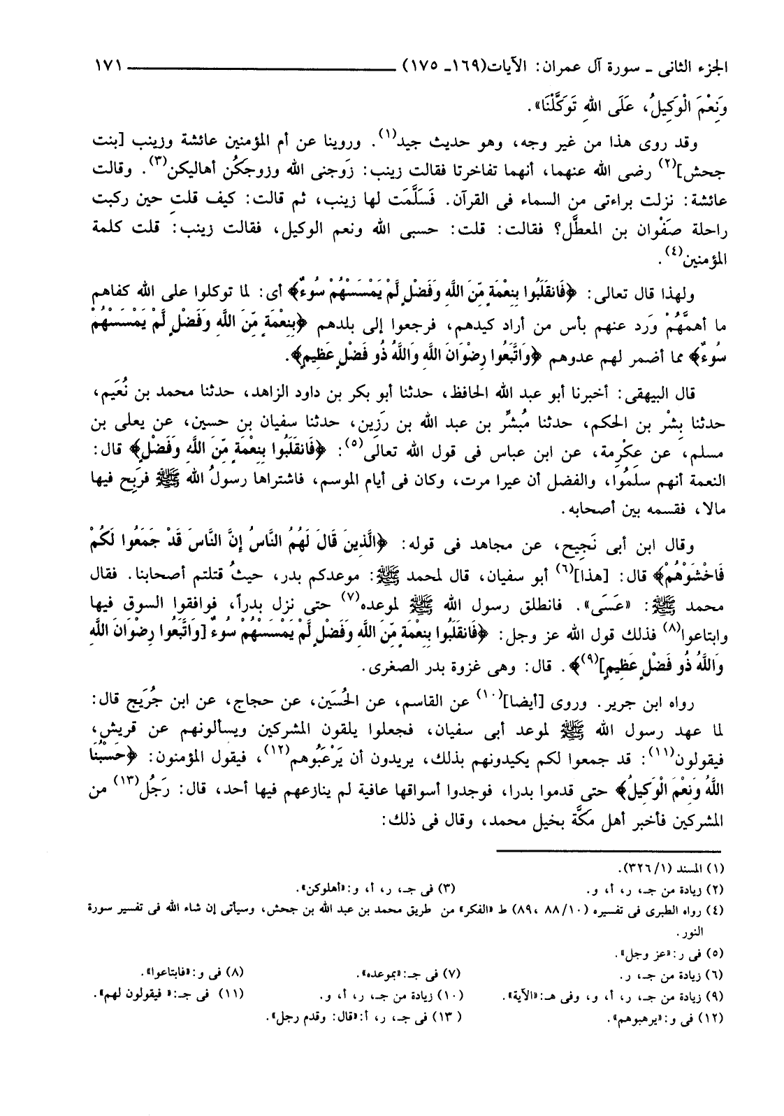 قَالَ الْبَيْهَقِيُّ: أَخْبَرَنَا أَبُو عَبْدِ اللَّهِ الْحَافِظُ، حَدَّثَنَا أَبُو بَكْرِ بْنُ دَاوُدَ الزَّاهِدُ، حَدَّثَنَا مُحَمَّدُ بْنُ نُعَيم، حَدَّثَنَا بِشْر بْنُ الْحَكَمِ، حَدَّثَنَا مُبشِّر بْنُ عَبْدِ اللَّهِ بْنِ رَزِين، حَدَّثَنَا سُفْيَانَ بْنِ حُسَيْنٍ، عَنْ يَعْلَى بْنِ مُسْلِمٍ، عَنْ عِكْرِمة، عَنِ ابْنِ عَبَّاسٍ فِي قَوْلِ اللَّهِ تَعَالَى (5) {فَانْقَلَبُوا بِنِعْمَةٍ مِنَ اللَّهِ وَفَضْلٍ} قَالَ: النِّعْمَةُ أَنَّهُمْ سلمُوا، وَالْفَضْلُ أَنَّ عِيرًا مَرَّتْ، وَكَانَ فِي أَيَّامِ الْمَوْسِمِ، فَاشْتَرَاهَا رسولُ اللَّهِ صَلَّى اللَّهُ عَلَيْهِ وَسَلَّمَ فَرَبِحَ فِيهَا مَالًا فَقَسَّمَهُ بَيْنَ أَصْحَابِهِ.