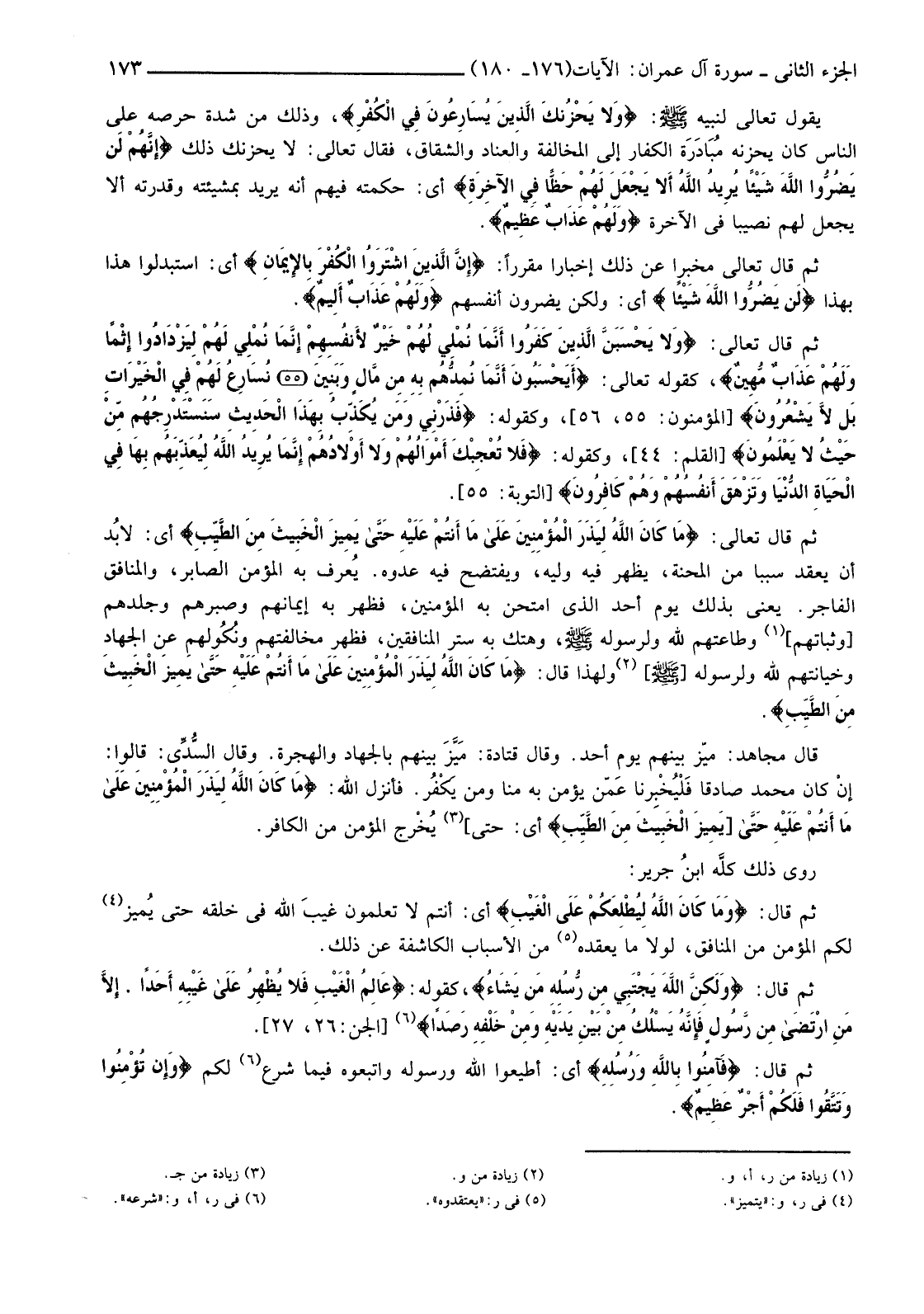 {وَلا يَحْزُنْكَ الَّذِينَ يُسَارِعُونَ فِي الْكُفْرِ إِنَّهُمْ لَنْ يَضُرُّوا اللَّهَ شَيْئًا يُرِيدُ اللَّهُ أَلا يَجْعَلَ لَهُمْ حَظًّا فِي الآخِرَةِ وَلَهُمْ عَذَابٌ عَظِيمٌ (176) إِنَّ الَّذِينَ اشْتَرَوُا الْكُفْرَ بِالإيمَانِ لَنْ يَضُرُّوا اللَّهَ شَيْئًا وَلَهُمْ عَذَابٌ أَلِيمٌ (177) وَلا يَحْسَبَنَّ الَّذِينَ كَفَرُوا أَنَّمَا نُمْلِي لَهُمْ خَيْرٌ لأنْفُسِهِمْ إِنَّمَا نُمْلِي لَهُمْ لِيَزْدَادُوا إِثْمًا وَلَهُمْ عَذَابٌ مُهِينٌ (178) مَا كَانَ اللَّهُ لِيَذَرَ الْمُؤْمِنِينَ عَلَى مَا أَنْتُمْ عَلَيْهِ حَتَّى يَمِيزَ الْخَبِيثَ مِنَ الطَّيِّبِ وَمَا كَانَ اللَّهُ لِيُطْلِعَكُمْ عَلَى الْغَيْبِ وَلَكِنَّ اللَّهَ يَجْتَبِي مِنْ رُسُلِهِ مَنْ يَشَاءُ فَآمِنُوا بِاللَّهِ وَرُسُلِهِ وَإِنْ تُؤْمِنُوا وَتَتَّقُوا فَلَكُمْ أَجْرٌ عَظِيمٌ (179) وَلا يَحْسَبَنَّ الَّذِينَ يَبْخَلُونَ بِمَا آتَاهُمُ اللَّهُ مِنْ فَضْلِهِ هُوَ خَيْرًا لَهُمْ بَلْ هُوَ شَرٌّ لَهُمْ سَيُطَوَّقُونَ مَا بَخِلُوا بِهِ يَوْمَ الْقِيَامَةِ وَلِلَّهِ مِيرَاثُ السَّمَاوَاتِ وَالأرْضِ وَاللَّهُ بِمَا تَعْمَلُونَ خَبِيرٌ (180) }