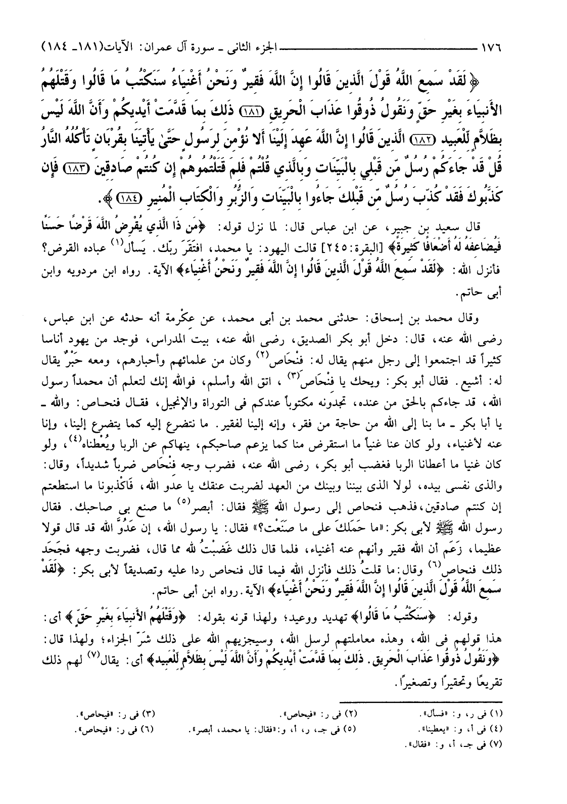 {لَقَدْ سَمِعَ اللَّهُ قَوْلَ الَّذِينَ قَالُوا إِنَّ اللَّهَ فَقِيرٌ وَنَحْنُ أَغْنِيَاءُ سَنَكْتُبُ مَا قَالُوا وَقَتْلَهُمُ الأنْبِيَاءَ بِغَيْرِ حَقٍّ وَنَقُولُ ذُوقُوا عَذَابَ الْحَرِيقِ (181) ذَلِكَ بِمَا قَدَّمَتْ أَيْدِيكُمْ وَأَنَّ اللَّهَ لَيْسَ بِظَلامٍ لِلْعَبِيدِ (182) الَّذِينَ قَالُوا إِنَّ اللَّهَ عَهِدَ إِلَيْنَا أَلا نُؤْمِنَ لِرَسُولٍ حَتَّى يَأْتِيَنَا بِقُرْبَانٍ تَأْكُلُهُ النَّارُ قُلْ قَدْ جَاءَكُمْ رُسُلٌ مِنْ قَبْلِي بِالْبَيِّنَاتِ وَبِالَّذِي قُلْتُمْ فَلِمَ قَتَلْتُمُوهُمْ إِنْ كُنْتُمْ صَادِقِينَ (183) فَإِنْ كَذَّبُوكَ فَقَدْ كُذِّبَ رُسُلٌ مِنْ قَبْلِكَ جَاءُوا بِالْبَيِّنَاتِ وَالزُّبُرِ وَالْكِتَابِ الْمُنِيرِ (184) }