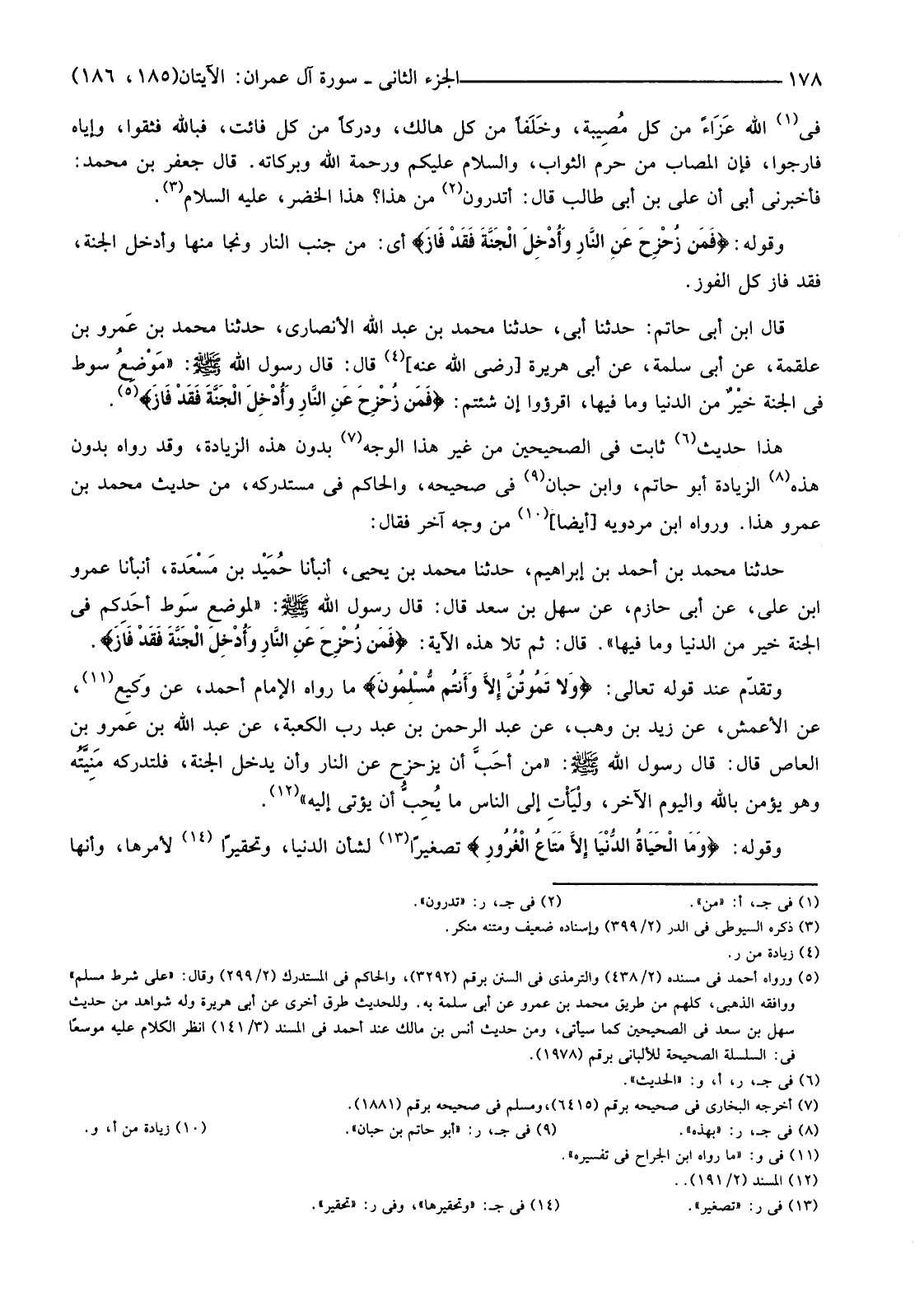 قَالَ ابْنُ أَبِي حَاتِمٍ: حَدَّثَنَا أَبِي، حَدَّثَنَا مُحَمَّدُ بْنُ عَبْدِ اللَّهِ الْأَنْصَارِيُّ، حَدَّثَنَا مُحَمَّدُ بْنُ عَمْرو بْنِ عَلْقَمَةَ، عَنْ أَبِي سَلَمَةَ، عَنْ أَبِي هُرَيْرَةَ [رَضِيَ اللَّهُ عَنْهُ] (4) قَالَ: قَالَ رَسُولُ اللَّهِ صَلَّى اللَّهُ عَلَيْهِ وَسَلَّمَ: "مَوْضع سَوْطٍ فِي الْجَنَّةِ خيرٌ مِنَ الدُّنْيَا وَمَا فيها، اقرؤوا إن شئم: {فَمَنْ زُحْزِحَ عَنِ النَّارِ وَأُدْخِلَ الْجَنَّةَ فَقَدْ فَازَ} (5) .
