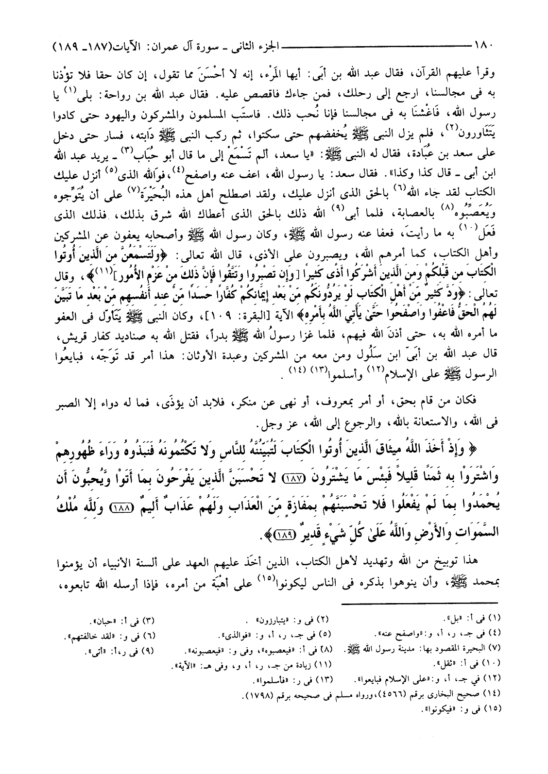 وَقَرَأَ عَلَيْهِمُ الْقُرْآنَ، فَقَالَ عَبْدُ اللَّهِ بْنُ أبَي: أَيُّهَا المَرْء، إِنَّهُ لَا أحْسَنَ مِمَّا تَقُولُ، إِنْ كَانَ حَقًّا فَلَا تؤْذنا بِهِ فِي مَجَالِسِنَا، ارْجِعْ إِلَى رَحْلِكَ، فَمَنْ جَاءَكَ فَاقْصُصْ عَلَيْهِ. فَقَالَ عَبْدُ اللَّهِ بْنُ رَوَاحَةَ: بَلَى (1) يَا رَسُولَ اللَّهِ، فَاغْشنَا بِهِ فِي مَجَالِسِنَا فَإِنَّا نُحب ذَلِكَ. فاستَب الْمُسْلِمُونَ وَالْمُشْرِكُونَ وَالْيَهُودُ حَتَّى كَادُوا يَتَثَاورون (2) فَلَمْ يَزَلِ النَّبِيُّ صَلَّى اللَّهُ عَلَيْهِ وَسَلَّمَ يُخفضهم حَتَّى سَكَتُوا، ثُمَّ رَكِبَ النَّبِيُّ صَلَّى اللَّهُ عَلَيْهِ وَسَلَّمَ دَابته، فَسَارَ حَتَّى دَخَلَ عَلَى سَعْدِ بْنِ عُبَادة، فَقَالَ لَهُ النَّبِيُّ صَلَّى اللَّهُ عَلَيْهِ وَسَلَّمَ: "يَا سَعْدُ، أَلَمْ تَسْمَع إِلَى مَا قَالَ أَبُو حُبَاب (3) -يُرِيدُ عَبْدَ اللَّهِ بْنَ أُبَيٍّ-قَالَ كَذَا وَكَذَا". فَقَالَ سَعْدٌ: يَا رَسُولَ اللَّهِ، اعْفُ عَنْهُ وَاصْفَحْ (4) فوَالله الَّذِي (5) أَنْزَلَ عَلَيْكَ الْكِتَابَ لَقَدْ جَاءَ اللَّهُ (6) بِالْحَقِّ الَّذِي أَنْزَلَ عَلَيْكَ، وَلَقَدِ اصْطَلَحَ أَهْلُ هَذِهِ البُحَيْرَة (7) عَلَى أَنْ يُتَوِّجوه وَيُعَصِّبُوه (8) بِالْعِصَابَةِ، فَلَمَّا أَبَى (9) اللَّهُ ذَلِكَ بِالْحَقِّ الَّذِي أَعْطَاكَ اللَّهُ شَرِقَ بِذَلِكَ، فَذَلِكَ الَّذِي فَعَل (10) بِهِ مَا رأيتَ، فَعَفَا عَنْهُ رَسُولُ اللَّهِ صَلَّى اللَّهُ عَلَيْهِ وَسَلَّمَ، وَكَانَ رَسُولُ اللَّهِ صَلَّى اللَّهُ عَلَيْهِ وَسَلَّمَ وَأَصْحَابُهُ يَعْفُونَ عَنِ الْمُشْرِكِينَ وَأَهْلِ الْكِتَابِ، كَمَا أَمَرَهُمُ اللَّهُ، وَيَصْبِرُونَ عَلَى الْأَذَى، قَالَ اللَّهُ تَعَالَى: {وَلَتَسْمَعُنَّ مِنَ الَّذِينَ أُوتُوا الْكِتَابَ مِنْ قَبْلِكُمْ وَمِنَ الَّذِينَ أَشْرَكُوا أَذًى كَثِيرًا [وَإِنْ تَصْبِرُوا وَتَتَّقُوا فَإِنَّ ذَلِكَ مِنْ عَزْمِ الأمُورِ] (11) } وَقَالَ تَعَالَى: {وَدَّ كَثِيرٌ مِنْ أَهْلِ الْكِتَابِ لَوْ يَرُدُّونَكُمْ مِنْ بَعْدِ إِيمَانِكُمْ كُفَّارًا حَسَدًا مِنْ عِنْدِ أَنْفُسِهِمْ مِنْ بَعْدِ مَا تَبَيَّنَ لَهُمُ الْحَقُّ فَاعْفُوا وَاصْفَحُوا حَتَّى يَأْتِيَ اللَّهُ بِأَمْرِهِ} الْآيَةَ [الْبَقَرَةِ:109] ، وَكَانَ النَّبِيُّ صَلَّى اللَّهُ عَلَيْهِ وَسَلَّمَ يَتَأوّل فِي الْعَفْوِ مَا أَمَرَهُ اللَّهُ بِهِ، حَتَّى أذنَ اللَّهُ فِيهِمْ، فَلَمَّا غَزَا رسولُ اللَّهِ صَلَّى اللَّهُ عَلَيْهِ وَسَلَّمَ بَدْرًا، فَقَتَلَ اللَّهُ بِهِ صَنَادِيدَ كُفَّارِ قُرَيْشٍ، قَالَ عَبْدُ اللَّهِ بْنُ أبَيّ ابْنُ سَلُول وَمَنْ مَعَهُ مِنَ الْمُشْرِكِينَ وَعَبَدَةِ الْأَوْثَانِ: هَذَا أَمْرٌ قَدْ تَوَجّه، فبايعُوا الرَّسُولَ صَلَّى اللَّهُ عَلَيْهِ وَسَلَّمَ عَلَى الْإِسْلَامِ (12) وَأَسْلَمُوا (13) (14) .