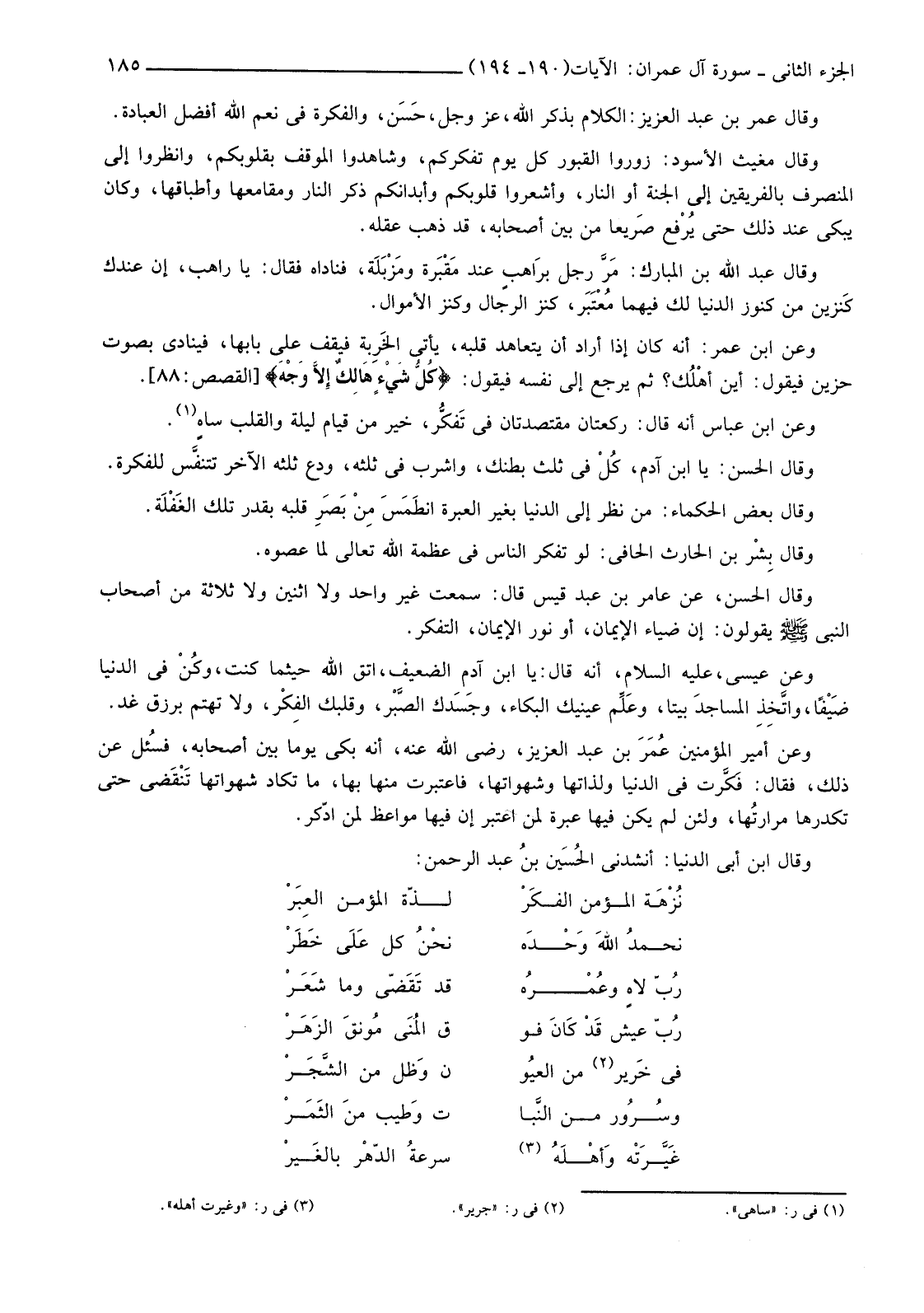 وَقَالَ ابْنُ أَبِي الدُّنْيَا: أَنْشَدَنِي الحُسَين بْنُ عَبْدِ الرَّحْمَنِ: نزهَة الْمُؤْمِنِ الفكَرْ ... لَذَّةُ الْمُؤْمِنِ العِبرْ ...