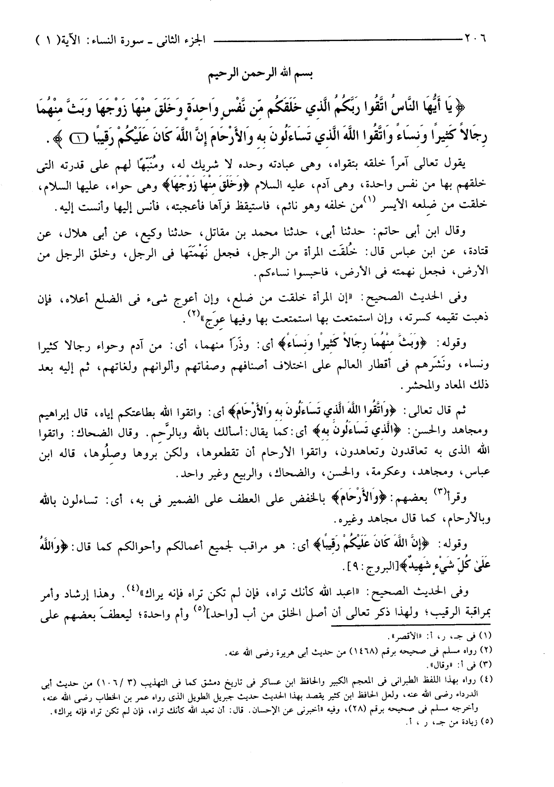 {يَا أَيُّهَا النَّاسُ اتَّقُوا رَبَّكُمُ الَّذِي خَلَقَكُمْ مِنْ نَفْسٍ وَاحِدَةٍ وَخَلَقَ مِنْهَا زَوْجَهَا وَبَثَّ مِنْهُمَا رِجَالا كَثِيرًا وَنِسَاءً وَاتَّقُوا اللَّهَ الَّذِي تَسَاءَلُونَ بِهِ وَالأرْحَامَ إِنَّ اللَّهَ كَانَ عَلَيْكُمْ رَقِيبًا (1) }