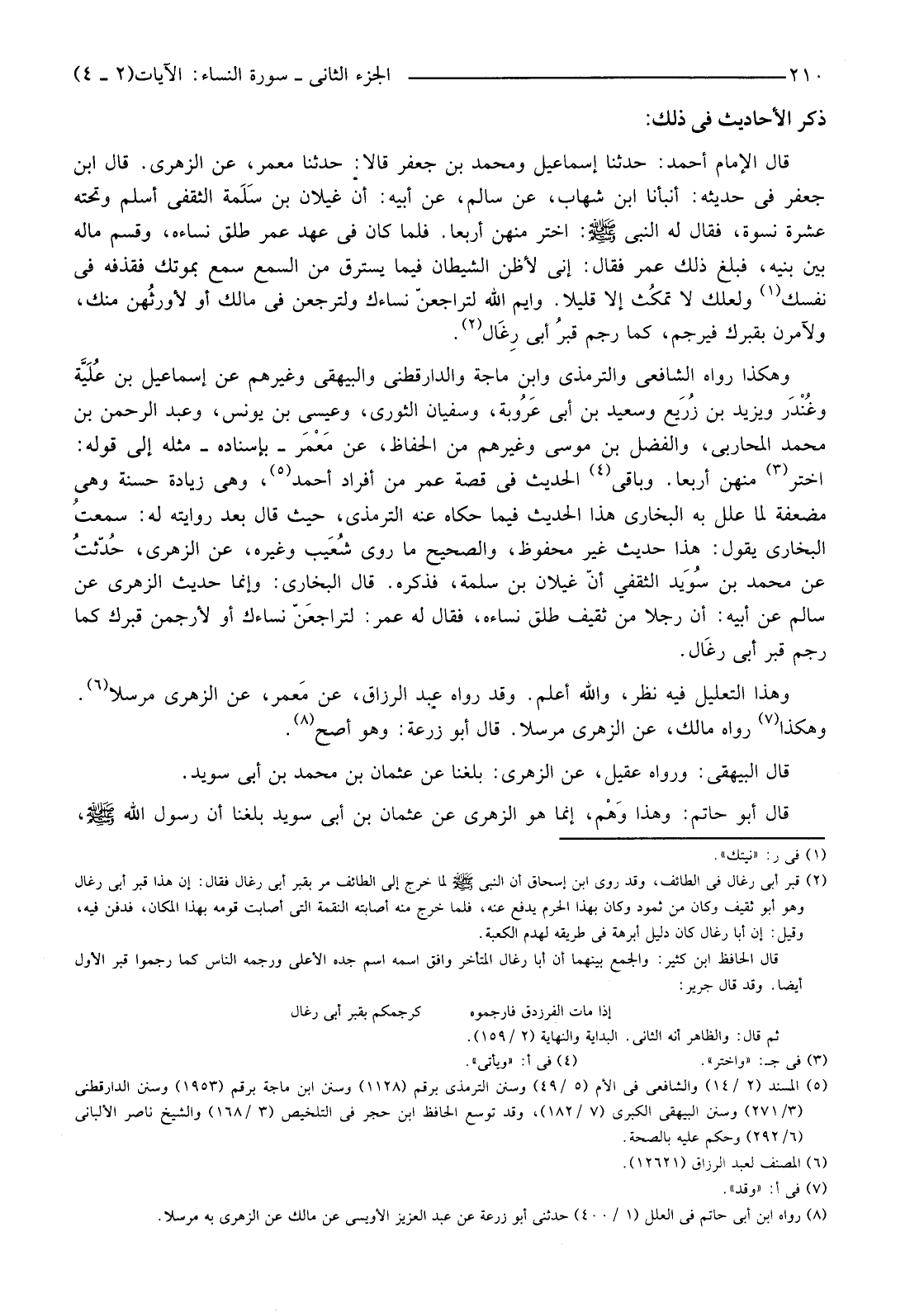 وَهَكَذَا رَوَاهُ الشَّافِعِيُّ وَالتِّرْمِذِيُّ وَابْنُ مَاجَهْ وَالدَّارَقُطْنِيُّ وَالْبَيْهَقِيُّ وَغَيْرُهُمْ عَنْ اسْمَاعِيلَ بْنِ عُلَيَّة وغُنْدَر وَيَزِيدَ بْنِ زُرَيع وَسَعِيدِ بْنِ أَبِي عَرُوبة، وَسُفْيَانَ الثَّوْرِيِّ، وَعِيسَى بْنِ يُونُسَ، وَعَبْدِ الرَّحْمَنِ بْنِ مُحَمَّدٍ الْمُحَارِبِيِّ، وَالْفَضْلِ بْنِ مُوسَى وَغَيْرِهِمْ مِنَ الْحُفَّاظِ، عَنْ مَعْمَر -بِإِسْنَادِهِ -مِثْلَهُ إِلَى قَوْلِهِ: اخْتَرْ (3) مِنْهُنَّ أَرْبَعًا. وَبَاقِي (4) الْحَدِيثِ فِي قِصَّةِ عُمَرَ مِنْ أَفْرَادِ أَحْمَدَ (5) وَهِيَ زِيَادَةٌ حَسَنَةٌ وَهِيَ مُضَعِّفَةٌ لِمَا عَلَّلَ بِهِ الْبُخَارِيُّ هَذَا الْحَدِيثَ فِيمَا حَكَاهُ عَنْهُ التِّرْمِذِيُّ، حَيْثُ قَالَ بَعْدَ رِوَايَتِهِ لَهُ: سمعتُ الْبُخَارِيَّ يَقُولُ: هَذَا حَدِيثٌ غَيْرُ مَحْفُوظٍ، وَالصَّحِيحُ مَا رَوَى شُعَيْب وَغَيْرُهُ، عَنِ الزُّهْرِيِّ، حُدّثتُ عَنْ مُحَمَّدِ بْنِ سُوَيد الثَّقَفِيِّ أَنَّ غَيْلَانَ بْنَ سَلَمَةَ، فَذَكَرَهُ. قَالَ الْبُخَارِيُّ: وَإِنَّمَا حَدِيثُ الزُّهْرِيِّ عَنْ سَالِمٍ عَنِ أَبِيهِ: أَنَّ رَجُلًا مِنْ ثَقِيفٍ طَلَّقَ نِسَاءَهُ، فَقَالَ لَهُ عُمَرُ: لتراجعَنَّ نِسَاءَكَ أَوْ لَأَرْجُمَنَّ قَبْرَكَ كَمَا رُجِمَ قَبْرُ أَبِي رغَال.