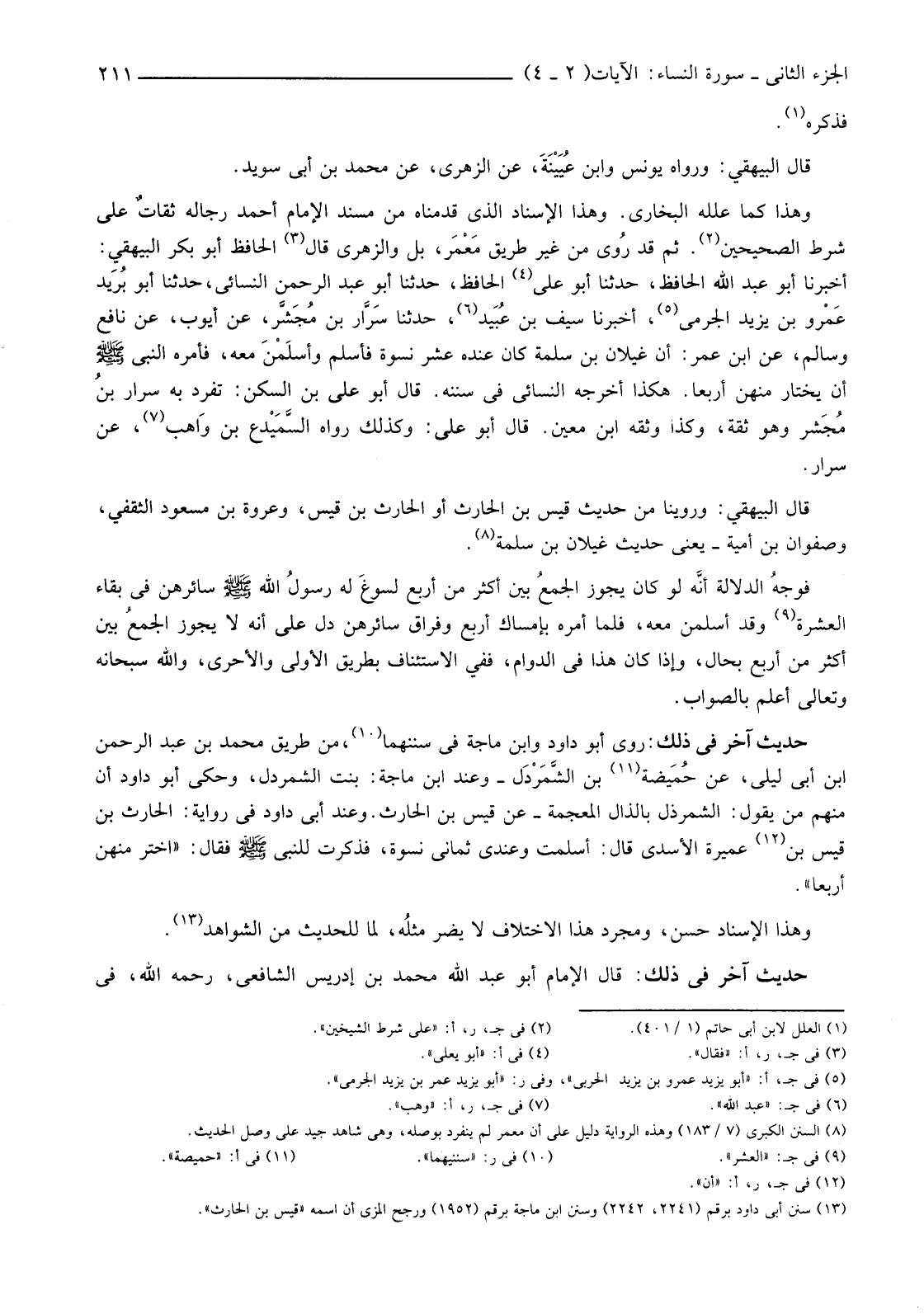 وَهَذَا كَمَا عَلَّلَهُ الْبُخَارِيُّ. وَهَذَا الْإِسْنَادُ الَّذِي قَدَّمْنَاهُ مِنْ مُسْنَدِ الْإِمَامِ أَحْمَدَ رِجَالُهُ ثقاتٌ عَلَى شَرْطِ الصَّحِيحَيْنِ (2) ثُمَّ قَدْ رُوي مِنْ غَيْرِ طَرِيقِ مَعْمَر، بَلْ وَالزُّهْرِيِّ قَالَ (3) الْحَافِظُ أَبُو بَكْرٍ الْبَيْهَقِيُّ: أَخْبَرَنَا أَبُو عَبْدِ اللَّهِ الْحَافِظُ، حَدَّثَنَا أَبُو عَلِيٍّ (4) الْحَافِظُ، حَدَّثَنَا أَبُو عَبْدِ الرَّحْمَنِ النَّسَائِيُّ، حَدَّثَنَا أَبُو بُرَيد عَمْرو بْنُ يَزِيدَ الْجَرْمِيُّ (5) أَخْبَرَنَا سَيْفُ بْنُ عُبَيد (6) حَدَّثَنَا سَرَّار بْنُ مُجَشَّر، عَنْ أَيُّوبَ، عَنْ نَافِعٍ وَسَالِمٍ، عَنِ ابْنِ عُمَرَ: أَنَّ غَيْلَانَ بْنَ سَلَمَةَ كَانَ عِنْدَهُ عَشْرُ نِسْوَةٍ فَأَسْلَمَ وأسلَمْنَ مَعَهُ، فَأَمَرَهُ النَّبِيُّ صَلَّى اللَّهُ عَلَيْهِ وَسَلَّمَ أَنْ يَخْتَارَ مِنْهُنَّ أَرْبَعًا. هَكَذَا أَخْرَجَهُ النَّسَائِيُّ فِي سُنَنِهِ. قَالَ أَبُو عَلِيِّ بْنُ السَّكَنِ: تَفَرَّدَ بِهِ سَرَّارُ بنُ مُجَشر وَهُوَ ثِقَةٌ، وَكَذَا وَثَّقَهُ ابْنُ مَعِينٍ. قَالَ أَبُو عَلِيٍّ: وَكَذَلِكَ رَوَاهُ السَّمَيْدع بْنُ وَاهِبٍ (7) عَنْ سَرَّارٍ.