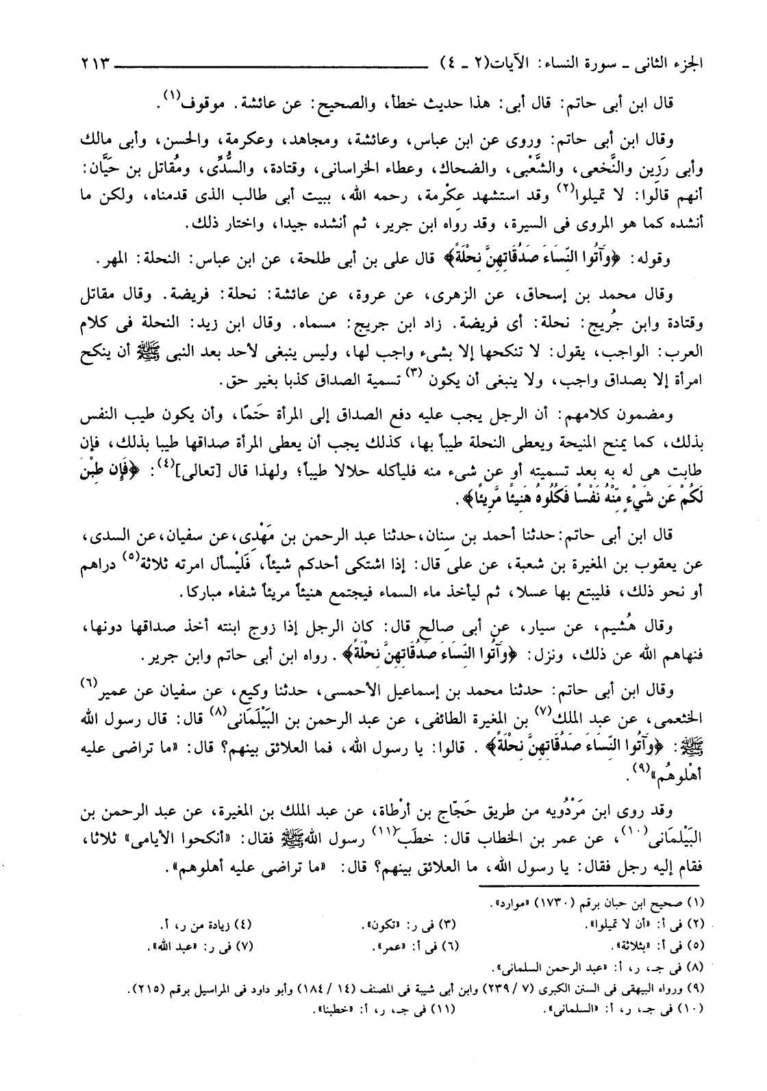 وَمَضْمُونُ كَلَامِهِمْ: أَنَّ الرَّجُلَ يَجِبُ عَلَيْهِ دَفْعُ الصَّدَاقِ إِلَى الْمَرْأَةِ حَتمًا، وَأَنْ يَكُونَ طَيِّبَ النَّفْسِ بِذَلِكَ، كَمَا يَمْنَحُ الْمَنِيحَةَ وَيُعْطِي النِّحْلَةَ طَيِّبًا بِهَا، كَذَلِكَ يَجِبُ أَنْ يُعْطِيَ الْمَرْأَةَ صَدَاقَهَا طَيِّبًا بِذَلِكَ، فَإِنْ طَابَتْ هِيَ لَهُ بِهِ بَعْدَ تَسْمِيَتِهِ أَوْ عَنْ شَيْءٍ مِنْهُ فَلْيَأْكُلْهُ حَلَالًا طَيِّبًا؛ وَلِهَذَا قَالَ [تَعَالَى] (4) {فَإِنْ طِبْنَ لَكُمْ عَنْ شَيْءٍ مِنْهُ نَفْسًا فَكُلُوهُ هَنِيئًا مَرِيئًا}