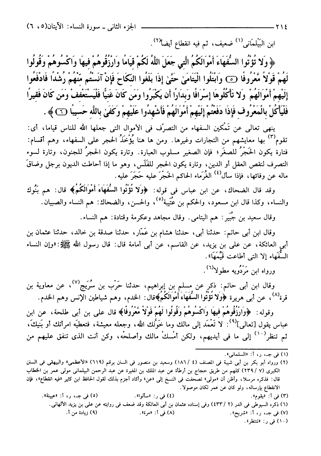 {وَلا تُؤْتُوا السُّفَهَاءَ أَمْوَالَكُمُ الَّتِي جَعَلَ اللَّهُ لَكُمْ قِيَامًا وَارْزُقُوهُمْ فِيهَا وَاكْسُوهُمْ وَقُولُوا لَهُمْ قَوْلا مَعْرُوفًا (5) وَابْتَلُوا الْيَتَامَى حَتَّى إِذَا بَلَغُوا النِّكَاحَ فَإِنْ آنَسْتُمْ مِنْهُمْ رُشْدًا فَادْفَعُوا إِلَيْهِمْ أَمْوَالَهُمْ وَلا تَأْكُلُوهَا إِسْرَافًا وَبِدَارًا أَنْ يَكْبَرُوا وَمَنْ كَانَ غَنِيًّا فَلْيَسْتَعْفِفْ وَمَنْ كَانَ فَقِيرًا فَلْيَأْكُلْ بِالْمَعْرُوفِ فَإِذَا دَفَعْتُمْ إِلَيْهِمْ أَمْوَالَهُمْ فَأَشْهِدُوا عَلَيْهِمْ وَكَفَى بِاللَّهِ حَسِيبًا (6) }