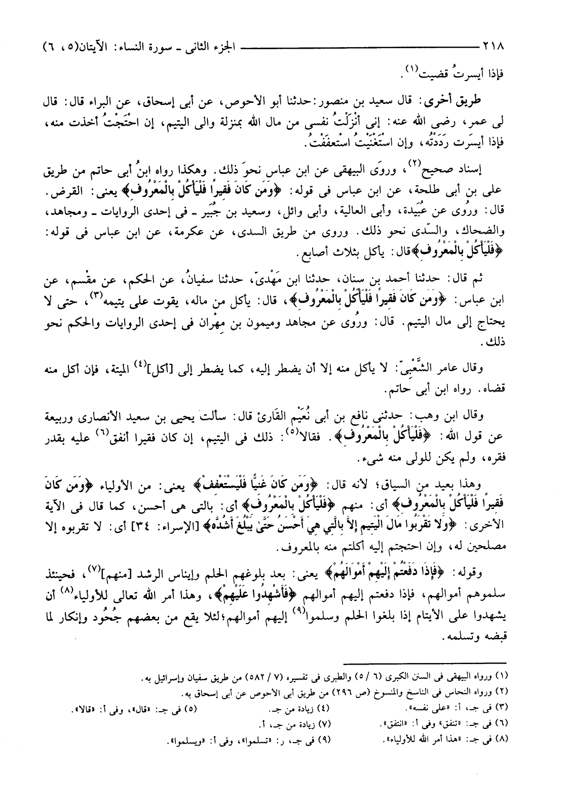 إِسْنَادٌ صَحِيحٌ (2) وروَى الْبَيْهَقِيُّ عَنِ ابْنِ عَبَّاسٍ نحوَ ذَلِكَ. وَهَكَذَا رَوَاهُ ابنُ أَبِي حَاتِمٍ مِنْ طَرِيقِ عَلِيِّ بْنِ أَبِي طَلْحَةَ، عَنِ ابْنِ عَبَّاسٍ فِي قَوْلِهِ: {وَمَنْ كَانَ فَقِيرًا فَلْيَأْكُلْ بِالْمَعْرُوفِ} يَعْنِي: الْقَرْضَ. قَالَ: ورُوي عَنْ عُبَيدة، وَأَبِي الْعَالِيَةِ، وَأَبِي وَائِلٍ، وَسَعِيدِ بْنِ جُبَير -فِي إِحْدَى الرِّوَايَاتِ -وَمُجَاهِدٍ، وَالضَّحَّاكِ، وَالسُّدِّيِّ نَحْوُ ذَلِكَ. وَرُوِيَ مِنْ طَرِيقِ السُّدِّيِّ، عَنْ عِكْرِمَةَ، عَنِ ابْنِ عَبَّاسٍ فِي قَوْلِهِ: {فَلْيَأْكُلْ بِالْمَعْرُوفِ} قَالَ: يَأْكُلُ بِثَلَاثِ أَصَابِعَ.