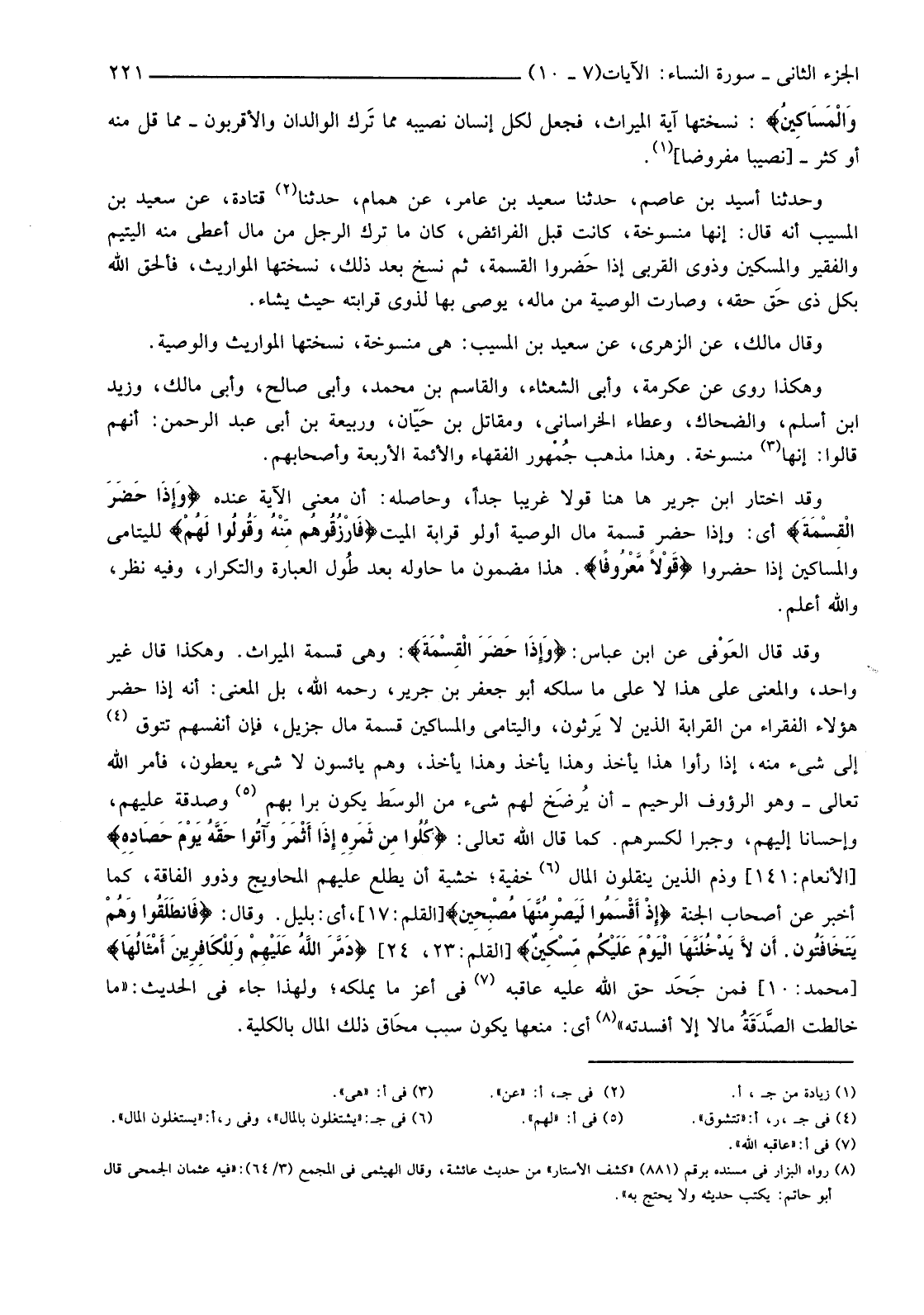 وَقَدْ قَالَ العَوْفي عَنِ ابْنِ عَبَّاسٍ: {وَإِذَا حَضَرَ الْقِسْمَةَ} وَهِيَ قِسْمَةُ الْمِيرَاثِ. وَهَكَذَا قَالَ غَيْرُ وَاحِدٍ، وَالْمَعْنَى عَلَى هَذَا لَا عَلَى مَا سَلَكَهُ أَبُو جَعْفَرِ بْنِ جَرِيرٍ، رَحِمَهُ اللَّهُ، بَلِ الْمَعْنَى: أَنَّهُ إِذَا حَضَرَ هَؤُلَاءِ الْفُقَرَاءُ مِنَ الْقَرَابَةِ الَّذِينَ لَا يَرثون، وَالْيَتَامَى وَالْمَسَاكِينُ قِسْمَةَ مَالٍ جَزِيلٍ، فَإِنَّ أَنْفُسَهُمْ تَتُوقُ (4) إِلَى شَيْءٍ مِنْهُ، إِذَا رَأَوْا هَذَا يَأْخُذُ وَهَذَا يَأْخُذُ وَهَذَا يَأْخُذُ، وَهُمْ يَائِسُونَ لَا شَيْءَ يُعْطَوْنَ، فَأَمَرَ اللَّهُ تَعَالَى -وَهُوَ الرَّءُوفُ الرَّحِيمُ -أَنْ يُرضَخ لَهُمْ شَيْءٌ مِنَ الوسَط يَكُونُ بِرًّا بِهِمْ (5) وَصَدَقَةً عَلَيْهِمْ، وَإِحْسَانًا إِلَيْهِمْ، وَجَبْرًا لِكَسْرِهِمْ. كَمَا قَالَ اللَّهُ تَعَالَى: {كُلُوا مِنْ ثَمَرِهِ إِذَا أَثْمَرَ وَآتُوا حَقَّهُ يَوْمَ حَصَادِهِ} [الْأَنْعَامِ:141] وَذَمَّ الَّذِينَ يَنْقُلُونَ الْمَالَ (6) خِفْيَةً؛ خَشْيَةَ أَنْ يَطَّلِعَ عَلَيْهِمُ الْمَحَاوِيجُ وَذَوُو الْفَاقَةِ، كَمَا أَخْبَرَ عَنِ أَصْحَابِ الْجَنَّةِ {إِذْ أَقْسَمُوا لَيَصْرِمُنَّهَا مُصْبِحِينَ} [الْقَلَمِ:17] أَيْ: بِلَيْلٍ. وَقَالَ: {فَانْطَلَقُوا وَهُمْ يَتَخَافَتُونَ. أَنْ لَا يَدْخُلَنَّهَا الْيَوْمَ عَلَيْكُمْ مِسْكِينٌ} [الْقَلَمِ:23، 24] {دَمَّرَ اللَّهُ عَلَيْهِمْ وَلِلْكَافِرِينَ أَمْثَالُهَا} [مُحَمَّدٍ:10] فَمَنْ جَحَد حَقَّ اللَّهِ عَلَيْهِ عَاقَبَهُ (7) فِي أَعَزِّ مَا يَمْلِكُهُ؛ وَلِهَذَا جَاءَ فِي الْحَدِيثِ: "مَا خَالَطَتِ الصَّدَقَةُ مَالًا إِلَّا أَفْسَدَتْهُ" (8) أَيْ: مَنْعُهَا يَكُونُ سَبَبَ مِحَاقِ ذَلِكَ الْمَالِ بالكلية.
