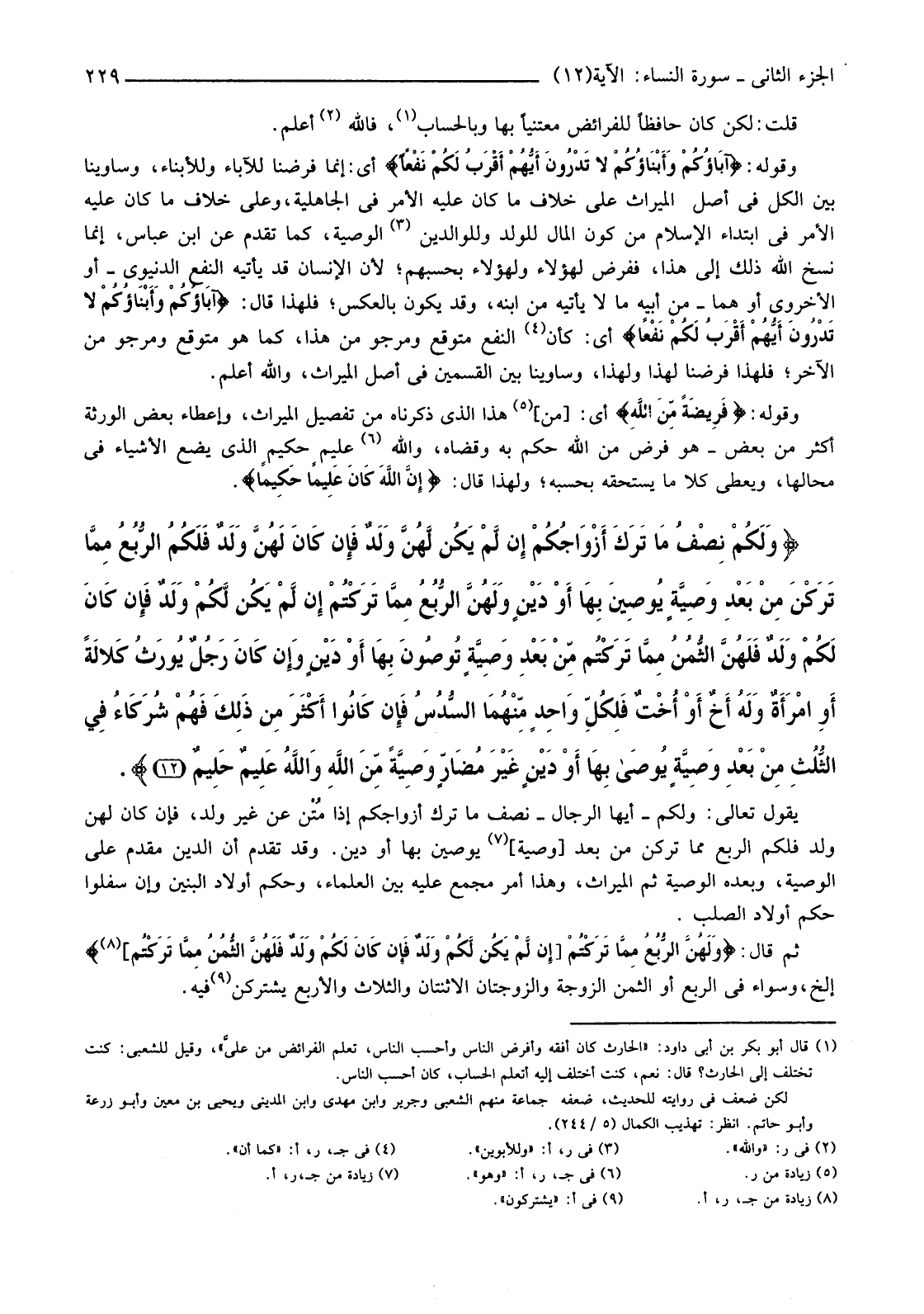 ثُمَّ قَالَ: {وَلَهُنَّ الرُّبُعُ مِمَّا تَرَكْتُمْ [إِنْ لَمْ يَكُنْ لَكُمْ وَلَدٌ فَإِنْ كَانَ لَكُمْ وَلَدٌ فَلَهُنَّ الثُّمُنُ مِمَّا تَرَكْتُمْ] (2) } إِلَخْ، وَسَوَاءٌ فِي الرُّبُعِ أَوِ الثُّمُنِ الزَّوْجَةُ والزوجتان الاثنتان والثلاث والأربع يشتركن (3) فيه.