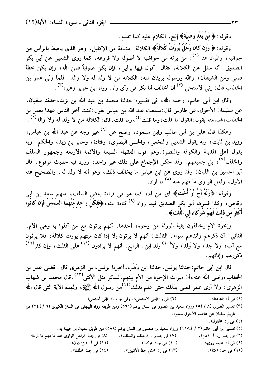 وَقَالَ ابْنُ أَبِي حَاتِمٍ، رَحِمَهُ اللَّهُ، فِي تَفْسِيرِهِ: حَدَّثَنَا مُحَمَّدُ بْنُ عَبْدِ اللَّهِ بْنِ يَزِيدَ، حَدَّثَنَا سُفْيَانُ، عَنْ سُلَيْمَانَ الْأَحْوَلِ، عَنْ طَاوُسٍ قَالَ: سَمِعْتُ عَبْدَ اللَّهِ بْنَ عَبَّاسٍ يَقُولُ: كُنْتُ آخِرَ النَّاسِ عَهْدًا بِعُمَرَ بْنِ الْخَطَّابِ، فَسَمِعْتُهُ يَقُولُ: الْقَوْلُ مَا قُلْتُ، وَمَا قُلْتُ (4) وَمَا قُلْتُ. قَالَ: الْكَلَالَةُ مَنْ لَا وَلَدَ لَهُ وَلَا وَالِدَ (5) .