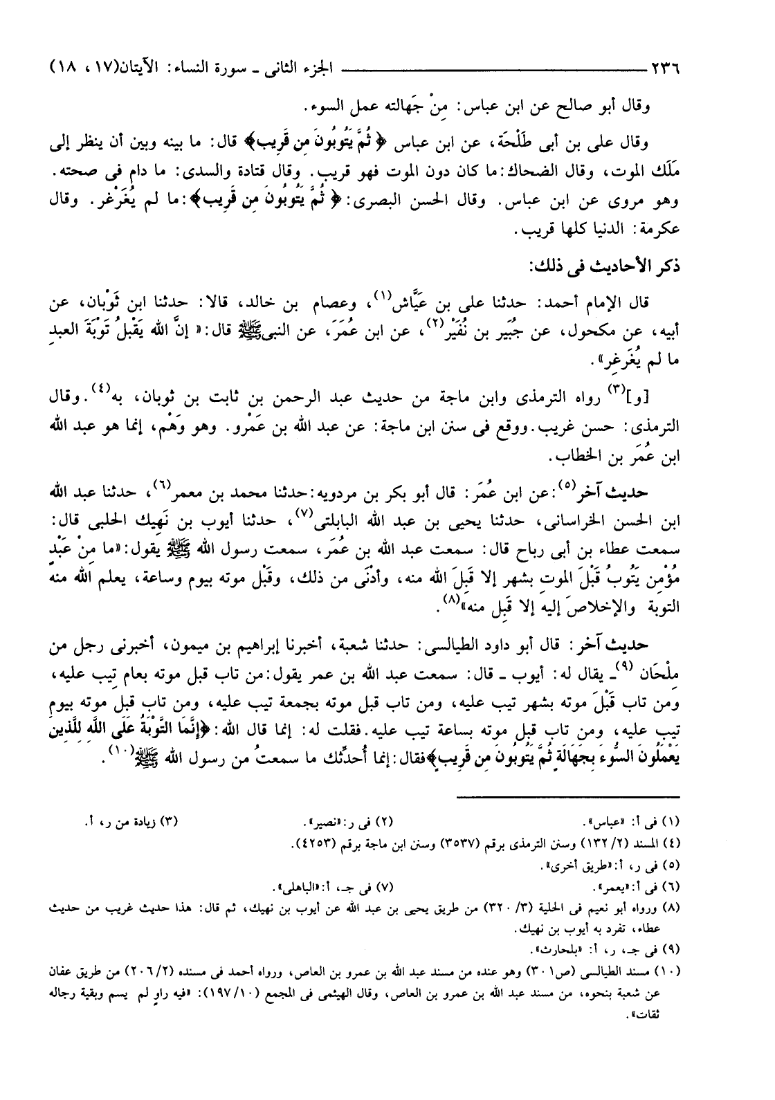 حَدِيثٌ آخَرُ: قَالَ أَبُو دَاوُدَ الطَّيَالِسِيُّ: حَدَّثَنَا شُعْبَةُ، أَخْبَرَنَا إِبْرَاهِيمُ بْنُ مَيْمُونٍ، أَخْبَرَنِي رَجُلٌ مَنْ مِلْحَان (9) يُقَالُ لَهُ: أَيُّوبُ -قَالَ: سَمِعْتُ عَبْدَ اللَّهِ بْنَ عُمَرَ يَقُولُ: مَنْ تَابَ قَبْلَ مَوْتِهِ بِعَامٍ تِيبَ عَلَيْهِ، وَمَنْ تَابَ قَبْلَ مَوْتِهِ بِشَهْرٍ تِيب عَلَيْهِ، وَمَنْ تَابَ قَبْلَ مَوْتِهِ بِجُمُعَةٍ تِيبَ عَلَيْهِ، وَمَنْ تَابَ قَبْلَ مَوْتِهِ بِيَوْمٍ تِيبَ عَلَيْهِ، وَمَنْ تَابَ قَبْلَ مَوْتِهِ بِسَاعَةٍ تِيبَ عَلَيْهِ. فَقُلْتُ لَهُ: إِنَّمَا قَالَ اللَّهُ: {إِنَّمَا التَّوْبَةُ عَلَى اللَّهِ لِلَّذِينَ يَعْمَلُونَ السُّوءَ بِجَهَالَةٍ ثُمَّ يَتُوبُونَ مِنْ قَرِيبٍ} فَقَالَ: إِنَّمَا أُحدِّثك مَا سَمِعْتُ مِنْ رَسُولِ اللَّهِ صَلَّى اللَّهُ عَلَيْهِ وسلم. (10)