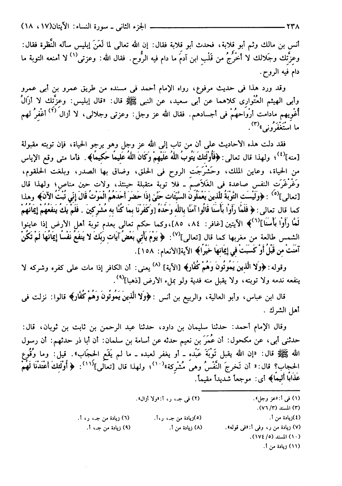 فَقَدْ دَلَّتْ هَذِهِ الْأَحَادِيثُ عَلَى أَنَّ مَنْ تَابَ إِلَى اللَّهِ عَزَّ وَجَلَّ وَهُوَ يَرْجُو الْحَيَاةَ، فَإِنَّ تَوْبَتَهُ مَقْبُولَةٌ [مِنْهُ] (4) ؛ وَلِهَذَا قَالَ تَعَالَى: {فَأُولَئِكَ يَتُوبُ اللَّهُ عَلَيْهِمْ وَكَانَ اللَّهُ عَلِيمًا حَكِيمًا} فَأَمَّا مَتَى وَقَعَ الْإِيَاسُ مِنَ الْحَيَاةِ، وَعَايَنَ الْمَلَكَ، وحَشْرَجَتِ الرُّوحُ فِي الْحَلْقِ، وَضَاقَ بِهَا الصَّدْرُ، وَبَلَغَتِ الْحُلْقُومَ، وَغَرْغَرَتِ النَّفْسُ صَاعِدَةً فِي الغَلاصِم -فَلَا تَوْبَةَ مُتَقَبَّلَةٌ حِينَئِذٍ، وَلَاتَ حِينَ مَنَاصٍ؛ وَلِهَذَا قَالَ [تَعَالَى] (5) {وَلَيْسَتِ التَّوْبَةُ لِلَّذِينَ يَعْمَلُونَ السَّيِّئَاتِ حَتَّى إِذَا حَضَرَ أَحَدَهُمُ الْمَوْتُ قَالَ إِنِّي تُبْتُ الآنَ} وَهَذَا كَمَا قَالَ تَعَالَى: {فَلَمَّا رَأَوْا بَأْسَنَا قَالُوا آمَنَّا بِاللَّهِ وَحْدَهُ [وَكَفَرْنَا بِمَا كُنَّا بِهِ مُشْرِكِينَ. فَلَمْ يَكُ يَنْفَعُهُمْ إِيمَانُهُمْ لَمَّا رَأَوْا بَأْسَنَا] (6) } الْآيَتَيْنِ، [غَافِرٍ:84، 85] وَكَمَا حَكَمَ تَعَالَى بِعَدَمِ تَوْبَةِ أَهْلِ الْأَرْضِ إِذَا عَايَنُوا الشَّمْسَ طَالِعَةً مِنْ مَغْرِبِهَا كَمَا قَالَ [تَعَالَى] (7) {يَوْمَ يَأْتِي بَعْضُ آيَاتِ رَبِّكَ لَا يَنْفَعُ نَفْسًا إِيمَانُهَا لَمْ تَكُنْ آمَنَتْ مِنْ قَبْلُ أَوْ كَسَبَتْ فِي إِيمَانِهَا خَيْرًا} الْآيَةَ [الْأَنْعَامِ:158] .