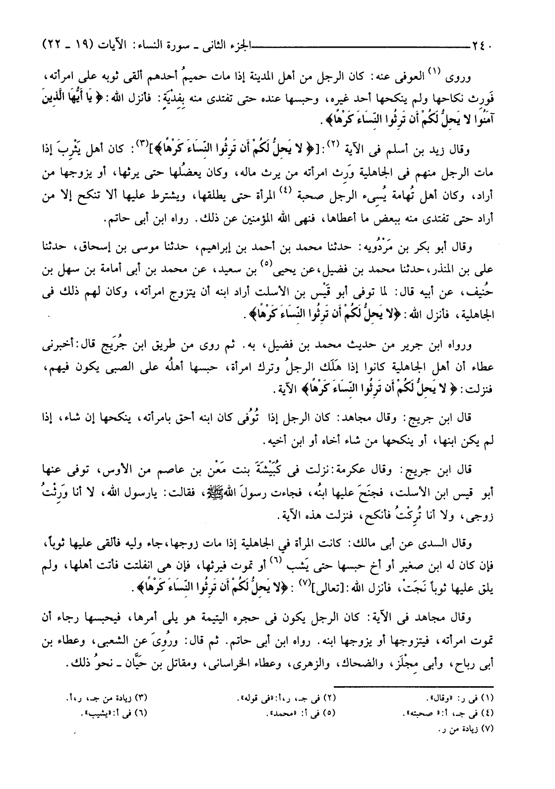 وَقَالَ زَيْدُ بْنُ أَسْلَمَ فِي الْآيَةِ (2) [ {لَا يَحِلُّ لَكُمْ أَنْ تَرِثُوا النِّسَاءَ كَرْهًا} ] (3) كَانَ أَهْلُ يَثْرِبَ إِذَا مَاتَ الرَّجُلُ مِنْهُمْ فِي الْجَاهِلِيَّةِ وَرِث امْرَأَتَهُ مَنْ يَرِثُ مَالَهُ، وَكَانَ يعضُلها حَتَّى يَرِثَهَا، أَوْ يُزَوِّجَهَا مَنْ أَرَادَ، وَكَانَ أَهْلُ تُهامة يُسِيء الرَّجُلُ صُحْبَةَ (4) الْمَرْأَةِ حَتَّى يُطَلِّقَهَا، وَيَشْتَرِطَ عَلَيْهَا أَنْ لَا تَنْكِحَ إِلَّا مَنْ أَرَادَ حَتَّى تَفْتَدِيَ مِنْهُ بِبَعْضِ مَا أَعْطَاهَا، فَنَهَى اللَّهُ الْمُؤْمِنِينَ عَنْ ذَلِكَ. رَوَاهُ ابْنُ أَبِي حَاتِمٍ.