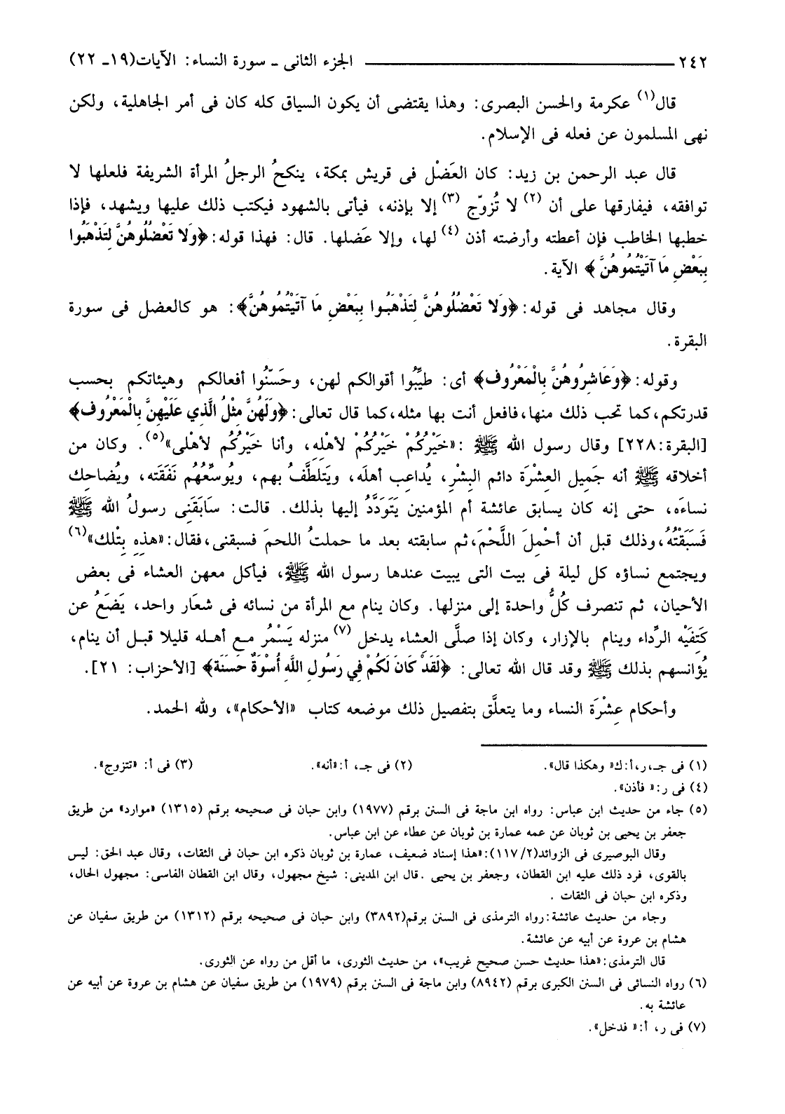 وَقَوْلُهُ: {وَعَاشِرُوهُنَّ بِالْمَعْرُوفِ} أَيْ: طيِّبُوا أَقْوَالَكُمْ لَهُنَّ، وحَسّنُوا أَفْعَالَكُمْ وَهَيْئَاتِكُمْ بِحَسَبِ قُدْرَتِكُمْ، كَمَا تُحِبُّ ذَلِكَ مِنْهَا، فَافْعَلْ أَنْتَ بِهَا مِثْلَهُ، كَمَا قَالَ تَعَالَى: {وَلَهُنَّ مِثْلُ الَّذِي عَلَيْهِنَّ بِالْمَعْرُوفِ} [الْبَقَرَةِ:228] وَقَالَ رَسُولُ اللَّهِ صَلَّى اللَّهُ عَلَيْهِ وَسَلَّمَ: "خَيْرُكُمْ خَيْرُكُمْ لأهْلِهِ، وَأَنَا خَيْرُكُم لأهْلي" (5) وَكَانَ مِنْ أَخْلَاقِهِ صَلَّى اللَّهُ عَلَيْهِ وَسَلَّمَ أَنَّهُ جَمِيل العِشْرَة دَائِمُ البِشْرِ، يُداعِبُ أهلَه، ويَتَلَطَّفُ بِهِمْ، ويُوسِّعُهُم نَفَقَته، ويُضاحِك نساءَه، حَتَّى إِنَّهُ كَانَ يُسَابِقُ عَائِشَةَ أُمَّ الْمُؤْمِنِينَ يَتَوَدَّدُ إِلَيْهَا بِذَلِكَ. قَالَتْ: سَابَقَنِي رسولُ اللَّهِ صَلَّى اللَّهُ عَلَيْهِ وَسَلَّمَ فَسَبَقْتُهُ، وَذَلِكَ قَبْلَ أَنْ أحملَ اللَّحْمَ، ثُمَّ سَابَقْتُهُ بَعْدَ مَا حملتُ اللحمَ فَسَبَقَنِي، فَقَالَ: "هذِهِ بتلْك" (6) وَيَجْتَمِعُ نِسَاؤُهُ كُلَّ لَيْلَةٍ فِي بَيْتِ الَّتِي يَبِيتُ عِنْدَهَا رَسُولُ اللَّهِ صَلَّى اللَّهُ عَلَيْهِ وَسَلَّمَ، فَيَأْكُلُ مَعَهُنَّ الْعَشَاءَ فِي بَعْضِ الْأَحْيَانِ، ثُمَّ تَنْصَرِفُ كُلُّ وَاحِدَةٍ إِلَى مَنْزِلِهَا. وَكَانَ يَنَامُ مَعَ الْمَرْأَةِ مِنْ نِسَائِهِ فِي شِعَارٍ وَاحِدٍ، يَضَعُ عَنْ كَتِفَيْه الرِّداء وَيَنَامُ بِالْإِزَارِ، وَكَانَ إِذَا صَلَّى الْعِشَاءَ يَدْخُلُ (7) مَنْزِلَهُ يَسْمُر مَعَ أَهْلِهِ قَلِيلًا قَبْلَ أَنْ يَنَامَ، يُؤانسهم بِذَلِكَ صَلَّى اللَّهُ عَلَيْهِ وَسَلَّمَ وَقَدْ قَالَ اللَّهُ تَعَالَى: {لَقَدْ كَانَ لَكُمْ فِي رَسُولِ اللَّهِ أُسْوَةٌ حَسَنَةٌ} [الْأَحْزَابِ: 21] .