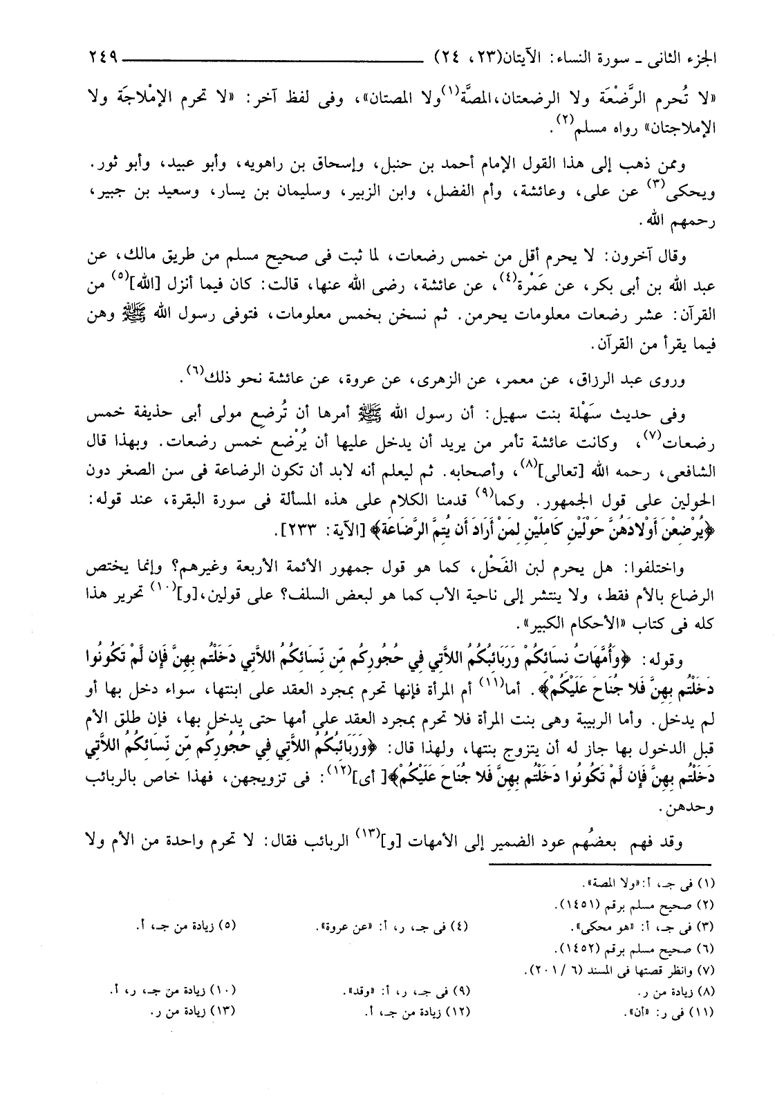 وَقَوْلُهُ: {وَأُمَّهَاتُ نِسَائِكُمْ وَرَبَائِبُكُمُ اللاتِي فِي حُجُورِكُمْ مِنْ نِسَائِكُمُ اللاتِي دَخَلْتُمْ بِهِنَّ فَإِنْ لَمْ تَكُونُوا دَخَلْتُمْ بِهِنَّ فَلا جُنَاحَ عَلَيْكُمْ} أَمَّا (11) أَمُّ الْمَرْأَةِ فَإِنَّهَا تَحْرُمُ بِمُجَرَّدِ الْعَقْدِ عَلَى ابْنَتِهَا، سَوَاءٌ دَخَلَ بِهَا أَوْ لَمْ يَدْخُلْ. وَأَمَّا الرَّبِيبَةُ وَهِيَ بِنْتُ الْمَرْأَةِ فَلَا تَحْرُمُ بِمُجَرَّدِ الْعَقْدِ عَلَى أُمِّهَا حَتَّى يَدْخُلَ بِهَا، فَإِنْ طَلَّقَ الْأُمَّ قَبْلَ الدُّخُولِ بِهَا جَازَ لَهُ أَنْ يَتَزَوَّجَ بِنْتَهَا، وَلِهَذَا قَالَ: {وَرَبَائِبُكُمُ اللاتِي فِي حُجُورِكُمْ مِنْ نِسَائِكُمُ اللاتِي دَخَلْتُمْ بِهِنَّ فَإِنْ لَمْ تَكُونُوا دَخَلْتُمْ بِهِنَّ فَلا جُنَاحَ عَلَيْكُمْ} [أَيْ] (12) فِي تَزْوِيجِهِنَّ، فَهَذَا خَاصٌّ بِالرَّبَائِبِ وَحْدَهُنَّ.