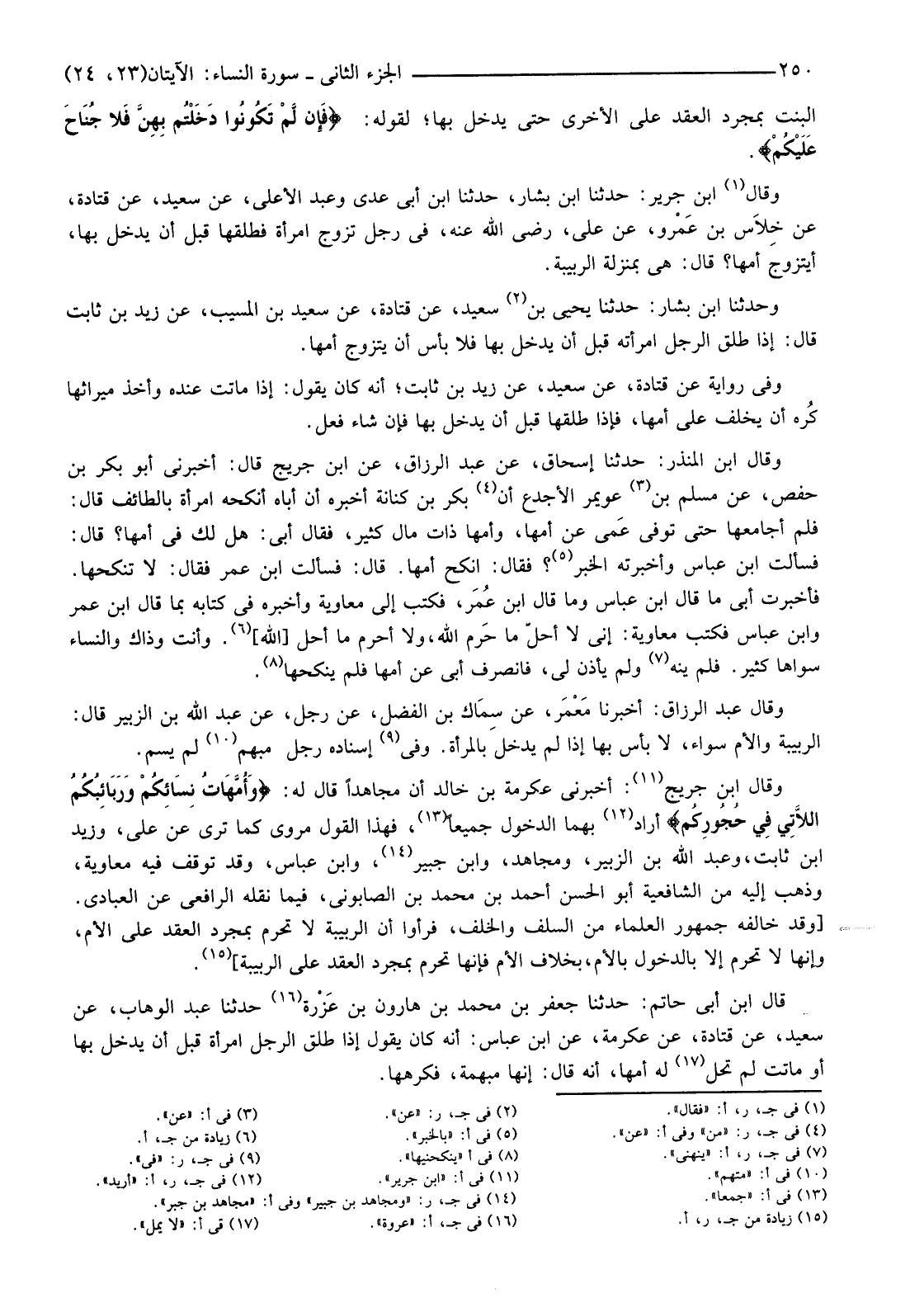 وَقَالَ ابْنُ جُرَيْجٍ (11) أَخْبَرَنِي عِكْرِمَةُ بْنُ خَالِدٍ أَنَّ مُجَاهِدًا قَالَ لَهُ: {وَأُمَّهَاتُ نِسَائِكُمْ وَرَبَائِبُكُمُ اللاتِي فِي حُجُورِكُمْ} أَرَادَ (12) بِهِمَا الدُّخُولَ جَمِيعًا (13) فَهَذَا الْقَوْلُ مَرْوِيٌّ كَمَا تَرَى عَنْ عَلِيٍّ، وَزَيْدِ بْنِ ثَابِتٍ، وَعَبْدِ اللَّهِ بْنِ الزُّبَيْرِ، وَمُجَاهِدٍ، وَابْنِ جُبَيْرٍ (14) وَابْنِ عَبَّاسٍ، وَقَدْ تَوَقَّفَ فِيهِ مُعَاوِيَةُ، وَذَهَبَ إِلَيْهِ مِنَ الشَّافِعِيَّةِ أَبُو الْحَسَنِ أَحْمَدُ بْنُ مُحَمَّدِ بْنِ الصَّابُونِيِّ، فِيمَا نَقَلَهُ الرَّافِعِيُّ عَنِ الْعَبَّادِيِّ. [وَقَدْ خَالَفَهُ جُمْهُورُ الْعُلَمَاءِ مِنَ السَّلَفِ وَالْخَلَفِ، فَرَأَوْا أَنَّ الرَّبِيبَةَ لَا تَحْرُمُ بِمُجَرَّدِ الْعَقْدِ عَلَى الْأُمِّ، وَأَنَّهَا لَا تَحْرُمُ إِلَّا بِالدُّخُولِ بِالْأُمِّ، بِخِلَافِ الْأُمِّ فَإِنَّهَا تَحْرُمُ بِمُجَرَّدِ الْعَقْدِ عَلَى الرَّبِيبَةِ] (15) .