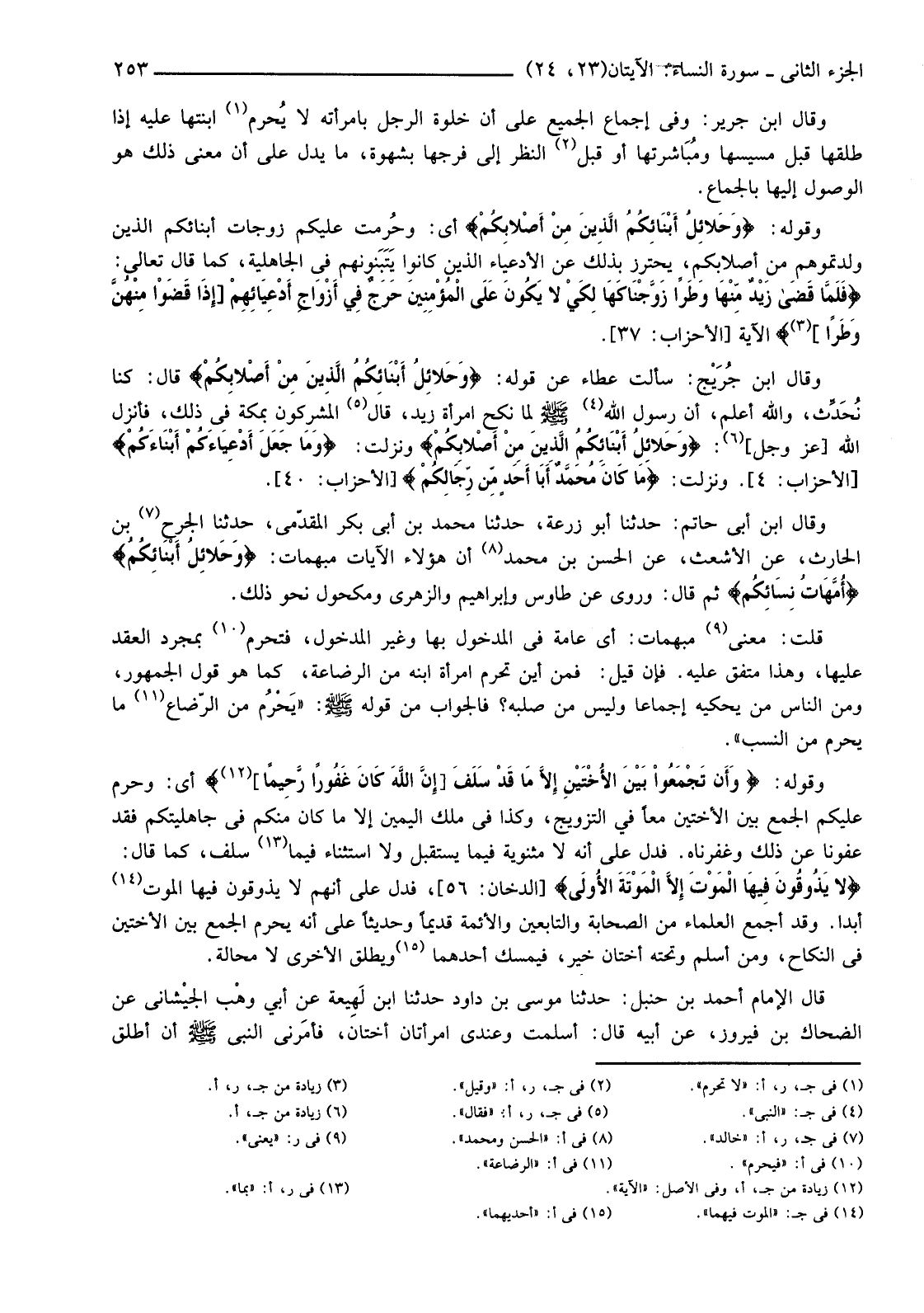 وَقَوْلُهُ: {وَحَلائِلُ أَبْنَائِكُمُ الَّذِينَ مِنْ أَصْلابِكُمْ} أَيْ: وحُرمت عَلَيْكُمْ زَوْجَاتُ أَبْنَائِكُمُ الَّذِينَ وَلَّدْتُمُوهُمْ مِنْ أَصْلَابِكُمْ، يُحْتَرَزُ بِذَلِكَ عَنِ الْأَدْعِيَاءِ الَّذِينَ كَانُوا يَتَبَنَونهم فِي الْجَاهِلِيَّةِ، كَمَا قَالَ تَعَالَى: {فَلَمَّا قَضَى زَيْدٌ مِنْهَا وَطَرًا زَوَّجْنَاكَهَا لِكَيْ لَا يَكُونَ عَلَى الْمُؤْمِنِينَ حَرَجٌ فِي أَزْوَاجِ أَدْعِيَائِهِمْ [إِذَا قَضَوْا مِنْهُنَّ وَطَرًا] (3) } الْآيَةَ [الْأَحْزَابِ: 37] .