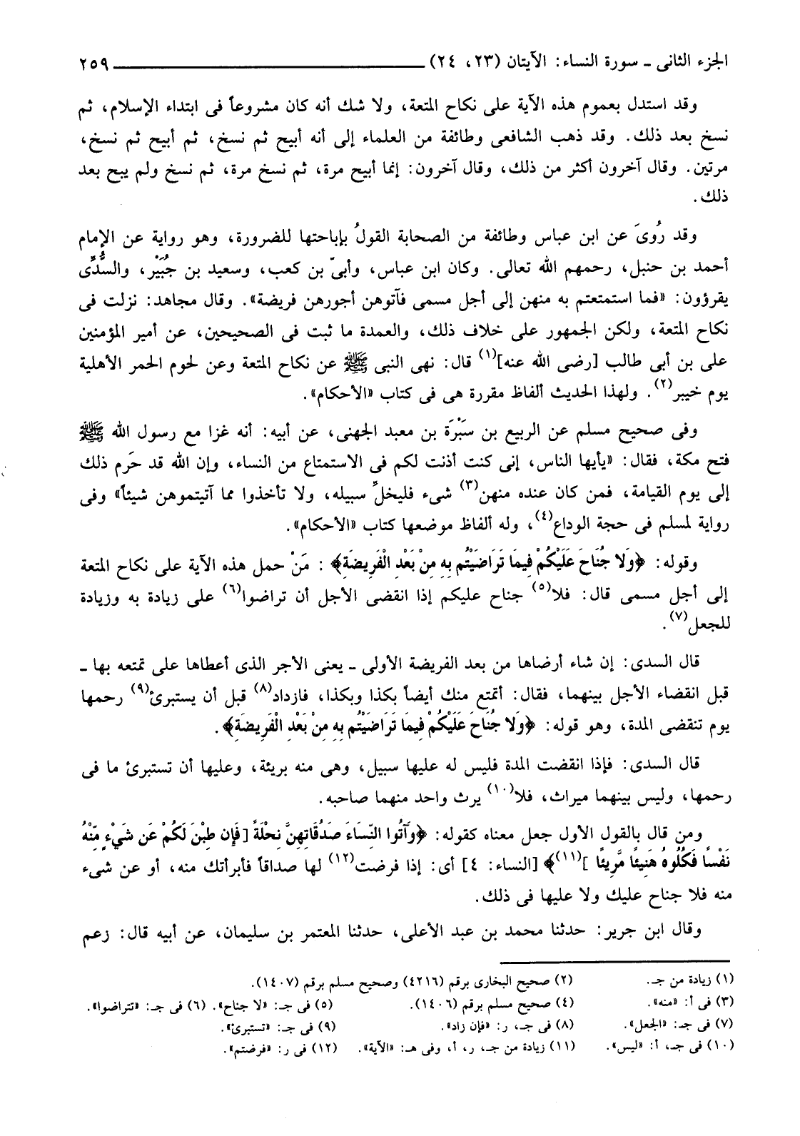 وَقَدْ رُويَ عَنِ ابْنِ عَبَّاسٍ وَطَائِفَةٍ مِنَ الصَّحَابَةِ القولُ بِإِبَاحَتِهَا لِلضَّرُورَةِ، وَهُوَ رِوَايَةٌ عَنِ الْإِمَامِ أَحْمَدَ بْنِ حَنْبَلٍ، رَحِمَهُمُ اللَّهُ تَعَالَى. وَكَانَ ابْنُ عَبَّاسٍ، وَأُبَيُّ بْنُ كَعْبٍ، وَسَعِيدُ بْنُ جُبَيْر، والسُّدِّي يَقْرَءُونَ: "فَمَا اسْتَمْتَعْتُمْ بِهِ مِنْهُنَّ إِلَى أَجَلٍ مُسَمَّى فَآتَوْهُنَّ أُجُورَهُنَّ فَرِيضَةً". وَقَالَ مُجَاهِدٌ: نَزَلَتْ فِي نِكَاحِ الْمُتْعَةِ، وَلَكِنَّ الْجُمْهُورَ عَلَى خِلَافِ ذَلِكَ، وَالْعُمْدَةُ مَا ثَبَتَ فِي الصَّحِيحَيْنِ، عَنْ أَمِيرِ الْمُؤْمِنِينَ عَلِيِّ بْنِ أَبِي طَالِبٍ [رَضِيَ اللَّهُ عَنْهُ] (1) قَالَ: نَهَى النَّبِيُّ صَلَّى اللَّهُ عَلَيْهِ وَسَلَّمَ عَنْ نِكَاحِ الْمُتْعَةِ وَعَنْ لُحُومِ الْحُمُرِ الْأَهْلِيَّةِ يَوْمَ خَيْبَرَ (2) وَلِهَذَا الْحَدِيثِ أَلْفَاظٌ مُقَرَّرَةٌ هِيَ فِي كِتَابِ "الْأَحْكَامِ".