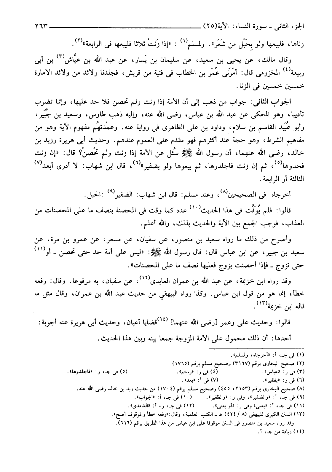 الْجَوَابُ الثَّانِي: جَوَابُ مَنْ ذَهَبَ إِلَى أَنَّ الْأَمَةَ إِذَا زَنَتْ وَلَمْ تُحْصَنَ فَلَا حَدَّ عَلَيْهَا، وَإِنَّمَا تُضْرَبُ تَأْدِيبًا، وَهُوَ الْمَحْكِيُّ عَنْ عَبْدِ اللَّهِ بْنِ عَبَّاسٍ، رَضِيَ اللَّهُ عَنْهُ، وَإِلَيْهِ ذَهَبَ طَاوُسٌ، وَسَعِيدُ بْنُ جُبَير، وَأَبُو عُبَيد الْقَاسِمُ بْنُ سَلَّامٍ، وَدَاوُدُ بْنُ عَلِيٍّ الظَّاهِرِيُّ فِي رِوَايَةٍ عَنْهُ. وعمْدتهُم مَفْهُومُ الْآيَةِ وَهُوَ مِنْ مَفَاهِيمِ الشَّرْطِ، وَهُوَ حُجَّةٌ عِنْدَ أَكْثَرِهِمْ فَهُوَ مُقَدَّمٌ عَلَى الْعُمُومِ عِنْدَهُمْ. وَحَدِيثُ أَبِي هُرَيْرَةَ وَزَيْدِ بْنِ خَالِدٍ، رَضِيَ اللَّهُ عَنْهُمَا، أَنَّ رَسُولَ اللَّهِ صَلَّى اللَّهُ عَلَيْهِ وَسَلَّمَ سُئل عَنِ الْأَمَةِ إِذَا زَنَتْ وَلَمْ تحْصنْ؟ قَالَ: "إِنْ زَنَتْ فَحِدُّوهَا (5) ثُمَّ إِنَّ زَنَتْ فَاجْلِدُوهَا ثُمَّ بِيعُوهَا وَلَوْ بِضَفِيرٍ" (6) قَالَ ابْنُ شِهَابٍ: لَا أَدْرِي أَبَعْدَ (7) الثَّالِثَةِ أَوِ الرَّابِعَةِ.