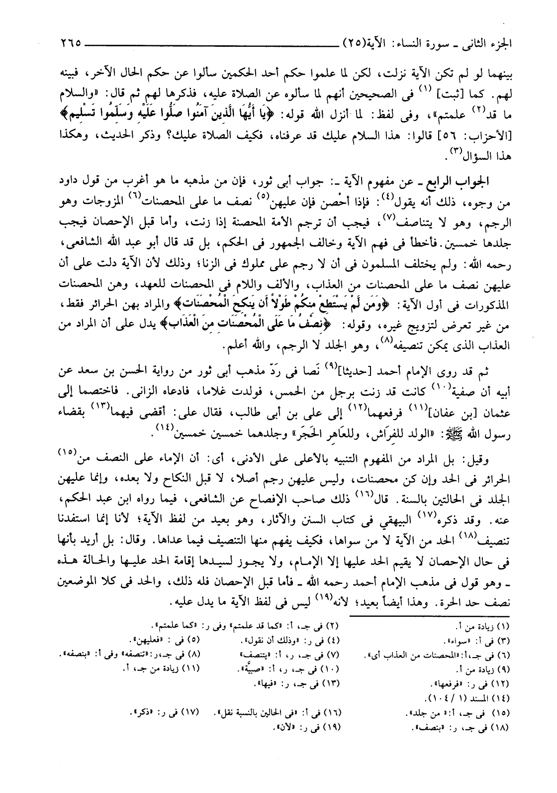 الْجَوَابُ الرَّابِعُ -عَنْ مَفْهُومِ الْآيَةِ-: جَوَابُ أَبِي ثَوْرٍ، فَإِنَّ مِنْ مَذْهَبِهِ مَا هُوَ أَغْرَبُ مِنْ قَوْلِ دَاوُدَ مِنْ وُجُوهٍ، ذَلِكَ أَنَّهُ يَقُولُ (4) فَإِذَا أحْصن فَإِنَّ عَلَيْهِنَّ نِصْفُ مَا عَلَى الْمُحْصَنَاتِ (5) الْمُزَوَّجَاتِ وَهُوَ الرَّجْمُ، وَهُوَ لَا يَتَنَاصَفُ (6) فَيَجِبُ أَنْ تُرْجَمَ الْأَمَّةُ الْمُحَصَنَةُ إِذَا زَنَتْ، وَأَمَّا قَبْلَ الْإِحْصَانِ فَيَجِبُ جَلْدُهَا خَمْسِينَ. فَأَخْطَأَ فِي فَهْمِ الْآيَةِ وَخَالَفَ الْجُمْهُورَ فِي الْحُكْمِ، بَلْ قَدْ قَالَ أَبُو عَبْدِ اللَّهِ الشَّافِعِيُّ، رَحِمَهُ اللَّهُ: وَلَمْ يَخْتَلِفِ الْمُسْلِمُونَ فِي أَنْ لَا رَجْمَ عَلَى مَمْلُوكٍ فِي الزِّنَا؛ وَذَلِكَ لِأَنَّ الْآيَةَ دَلَّتْ عَلَى أَنَّ عَلَيْهِنَّ نِصْفُ مَا عَلَى الْمُحْصَنَاتِ مِنَ الْعَذَابِ، وَالْأَلِفُ وَاللَّامُ فِي الْمُحْصَنَاتِ لِلْعَهْدِ، وَهُنَّ الْمُحْصَنَاتُ الْمَذْكُورَاتُ فِي أَوَّلِ الْآيَةِ: {وَمَنْ لَمْ يَسْتَطِعْ مِنْكُمْ طَوْلا أَنْ يَنْكِحَ الْمُحْصَنَاتِ} وَالْمُرَادُ بِهِنَّ الْحَرَائِرُ فَقَطْ، مِنْ غَيْرِ تَعَرُّضٍ لِتَزْوِيجِ غَيْرِهِ، وَقَوْلِهِ: {نِصْفُ مَا عَلَى الْمُحْصَنَاتِ مِنَ الْعَذَابِ} يَدُلُّ عَلَى أَنَّ الْمُرَادَ مِنَ الْعَذَابِ الَّذِي يُمْكِنُ تَنْصِيفُهُ (7) وَهُوَ الْجَلْدُ لَا الرَّجْمُ، وَاللَّهُ أَعْلَمُ.