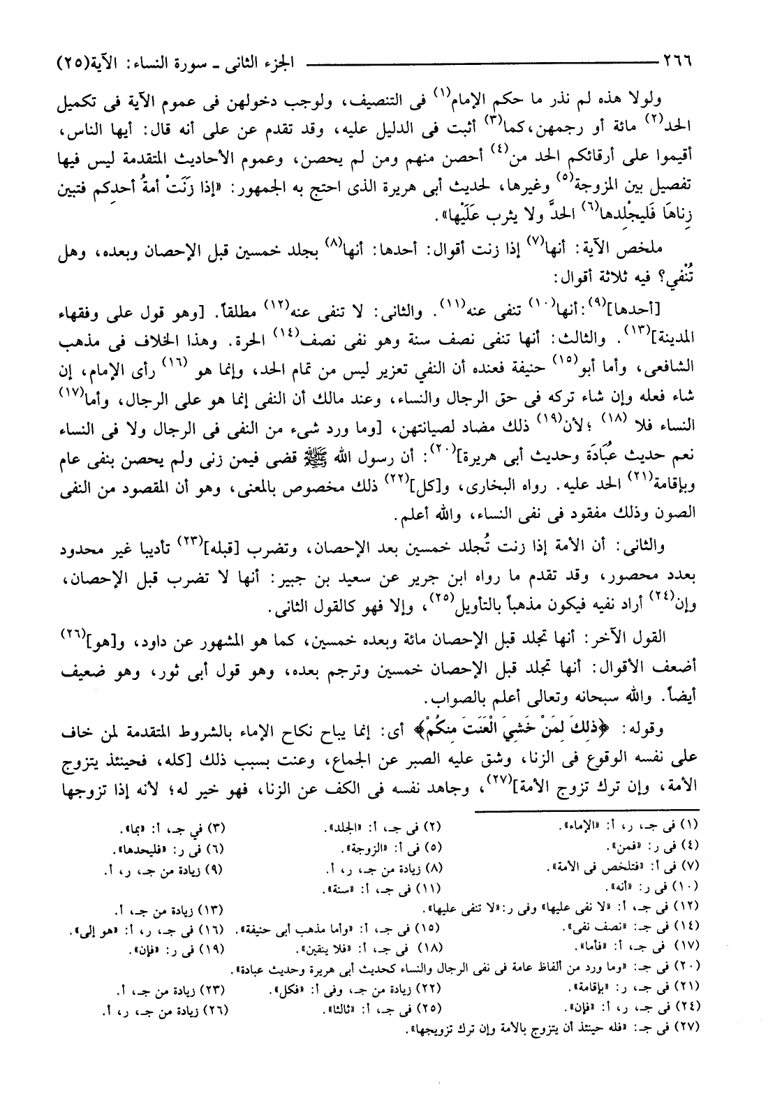 مُلَخَّصُ الْآيَةِ: أَنَّهَا (7) إِذَا زَنَتْ أَقْوَالٌ: أَحَدُهَا: أنها (8) بجلد خَمْسِينَ قَبْلَ الْإِحْصَانِ وَبَعْدَهُ، وَهَلْ تُنْفَى؟ فِيهِ ثَلَاثَةُ أَقْوَالٍ: