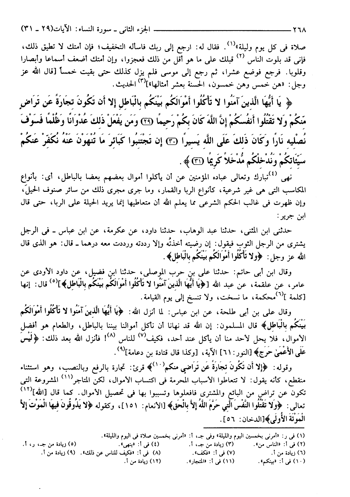 {يَا أَيُّهَا الَّذِينَ آمَنُوا لَا تَأْكُلُوا أَمْوَالَكُمْ بَيْنَكُمْ بِالْبَاطِلِ إِلا أَنْ تَكُونَ تِجَارَةً عَنْ تَرَاضٍ مِنْكُمْ وَلا تَقْتُلُوا أَنْفُسَكُمْ إِنَّ اللَّهَ كَانَ بِكُمْ رَحِيمًا (29) وَمَنْ يَفْعَلْ ذَلِكَ عُدْوَانًا وَظُلْمًا فَسَوْفَ نُصْلِيهِ نَارًا وَكَانَ ذَلِكَ عَلَى اللَّهِ يَسِيرًا (30) إِنْ تَجْتَنِبُوا كَبَائِرَ مَا تُنْهَوْنَ عَنْهُ نُكَفِّرْ عَنْكُمْ سَيِّئَاتِكُمْ وَنُدْخِلْكُمْ مُدْخَلا كَرِيمًا (31) }
