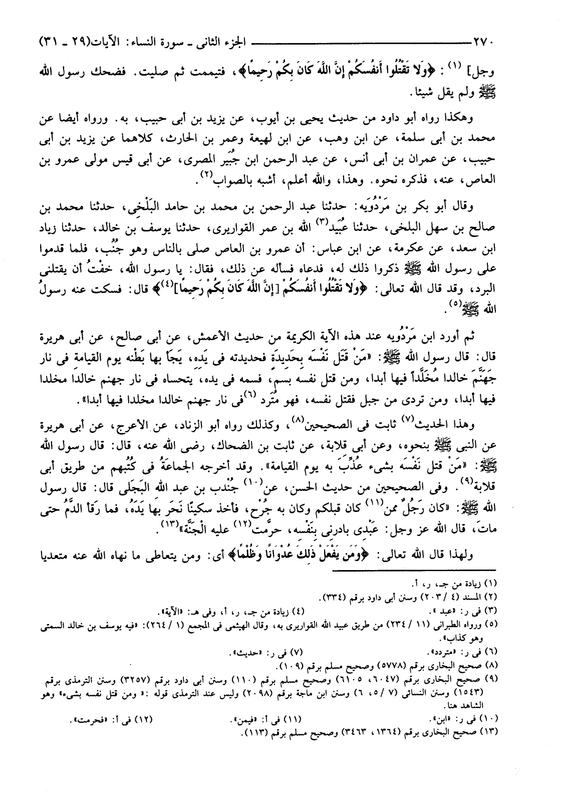 (9) صحيح البخاري برقم (6047، 6105) وصحيح مسلم برقم (110) وسنن أبي داود برقم (3257) وسنن الترمذي برقم (1543) وسنن النسائي (7/5،6) وسنن ابن ماجه برقم (2098) وليس عند الترمذي قوله: "ومن قتل نفسه بشيء" وهو الشاهد هنا.