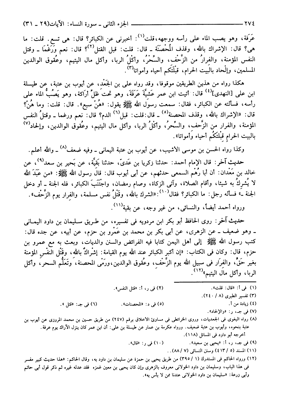 حَدِيثٌ آخَرُ: رَوَى الْحَافِظُ أبو بكر ابن مَرْدَوَيْهِ فِي تَفْسِيرِهِ، مِنْ طَرِيقِ سُلَيْمَانَ بْنِ دَاوُدَ الْيَمَانِيِّ -وَهُوَ ضَعِيفٌ-عَنِ الزُّهْرِيِّ، عَنْ أَبِي بَكْرِ بْنِ مُحَمَّدِ بْنِ عَمْرو بْنِ حَزْمٍ، عَنْ أَبِيهِ، عَنْ جَدِّهِ قَالَ: كَتَبَ رَسُولُ اللَّهِ صَلَّى اللَّهُ عَلَيْهِ وَسَلَّمَ إلى أَهْلِ الْيَمَنِ كِتَابًا فِيهِ الْفَرَائِضُ وَالسُّنَنُ وَالدِّيَاتُ، وَبَعَثَ بِهِ مَعَ عَمْرِو بْنِ حَزْمٍ، قَالَ: وَكَانَ فِي الْكِتَابِ: "إِنَّ أَكْبَرَ الْكَبَائِرِ عِنْدَ اللَّهِ يَوْمَ الْقِيَامَةِ: إشْراكٌ باللهِ وقَتْل النفْسِ الْمُؤْمِنَةِ بِغَيْرِ حَقٍّ، والفِرارُ فِي سَبِيلِ اللَّهِ يَوْمَ الزَّحْفِ، وعُقوق الْوَالِدَيْنِ، ورَمْي الْمُحْصَنَةِ، وتَعَلُّم السحر، وأكل الربا، وأكل مال اليتيم" (12) .