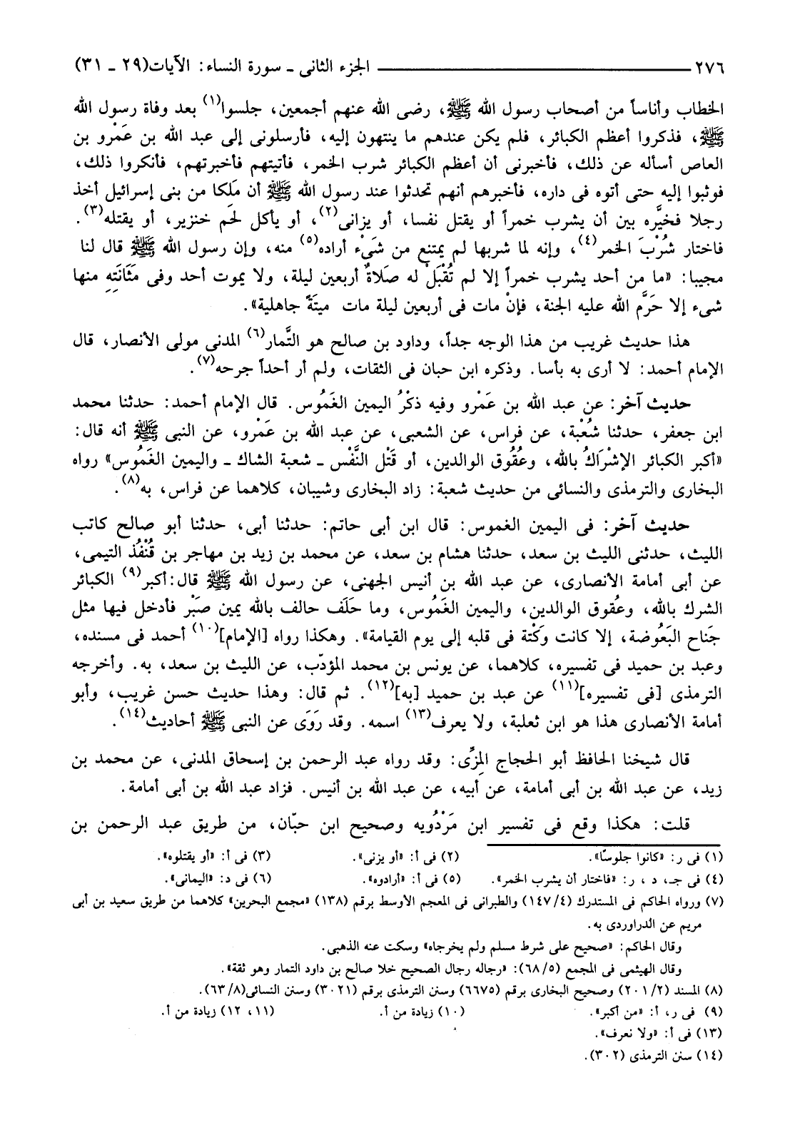 حَدِيثٌ آخَرُ: فِي الْيَمِينِ الْغَمُوسِ: "قَالَ ابْنُ أَبِي حَاتِمٍ: حَدَّثَنَا أَبِي، حَدَّثَنَا أَبُو صَالِحٍ كَاتِبُ اللَّيْثِ، حَدَّثَنَا اللَّيْثُ بْنُ سَعْدٍ، حَدَّثَنَا هِشَامُ بْنُ سَعْدٍ، عَنْ مُحَمَّدِ بْنِ يَزِيدَ بْنِ مُهَاجِرِ بْنِ قُنْفُذ التَّيْمِيِّ، عَنْ أَبِي أُمَامَةَ الْأَنْصَارِيِّ، عَنْ عَبْدِ اللَّهِ بْنِ أُنَيْسٍ الْجُهَنِيِّ، عَنْ رَسُولِ اللَّهِ صَلَّى اللَّهُ عَلَيْهِ وَسَلَّمَ قَالَ: أَكْبَرُ (9) الْكَبَائِرِ الشِّرْكُ بِاللَّهِ، وعُقوق الْوَالِدَيْنِ، وَالْيَمِينُ الغَمُوس، وَمَا حَلَفَ حَالِفٌ بِاللَّهِ يَمِينَ صَبْر فَأَدْخَلَ فِيهَا مِثْلَ جَنَاحِ الْبَعُوضَةِ، إِلَّا كَانَتْ وَكْتَةً فِي قَلْبِهِ إِلَى يَوْمِ الْقِيَامَةِ". وَهَكَذَا رَوَاهُ] الْإِمَامُ [ (10) أَحْمَدُ فِي مُسْنَدِهِ، وَعَبْدُ بْنُ حُمَيْدٍ فِي تَفْسِيرِهِ، كِلَاهُمَا عَنْ يُونُسَ بْنِ مُحَمَّدٍ الْمُؤَدِّبِ، عَنِ اللَّيْثِ بْنِ سَعْدٍ، بِهِ. وَأَخْرَجَهُ التِّرْمِذِيُّ] فِي تَفْسِيرِهِ [ (11) عَنْ عَبْدِ بْنِ حُمَيْدٍ] بِهِ [ (12) ثُمَّ قَالَ: وَهَذَا حَدِيثٌ حَسَنٌ غَرِيبٌ، وَأَبُو أُمَامَةَ الْأَنْصَارِيُّ هَذَا هُوَ ابْنُ ثَعْلَبَةَ، وَلَا يُعْرَفُ (13) اسْمُهُ. وَقَدْ رَوَى عَنِ النَّبِيِّ صَلَّى اللَّهُ عَلَيْهِ وَسَلَّمَ أَحَادِيثَ (14) .