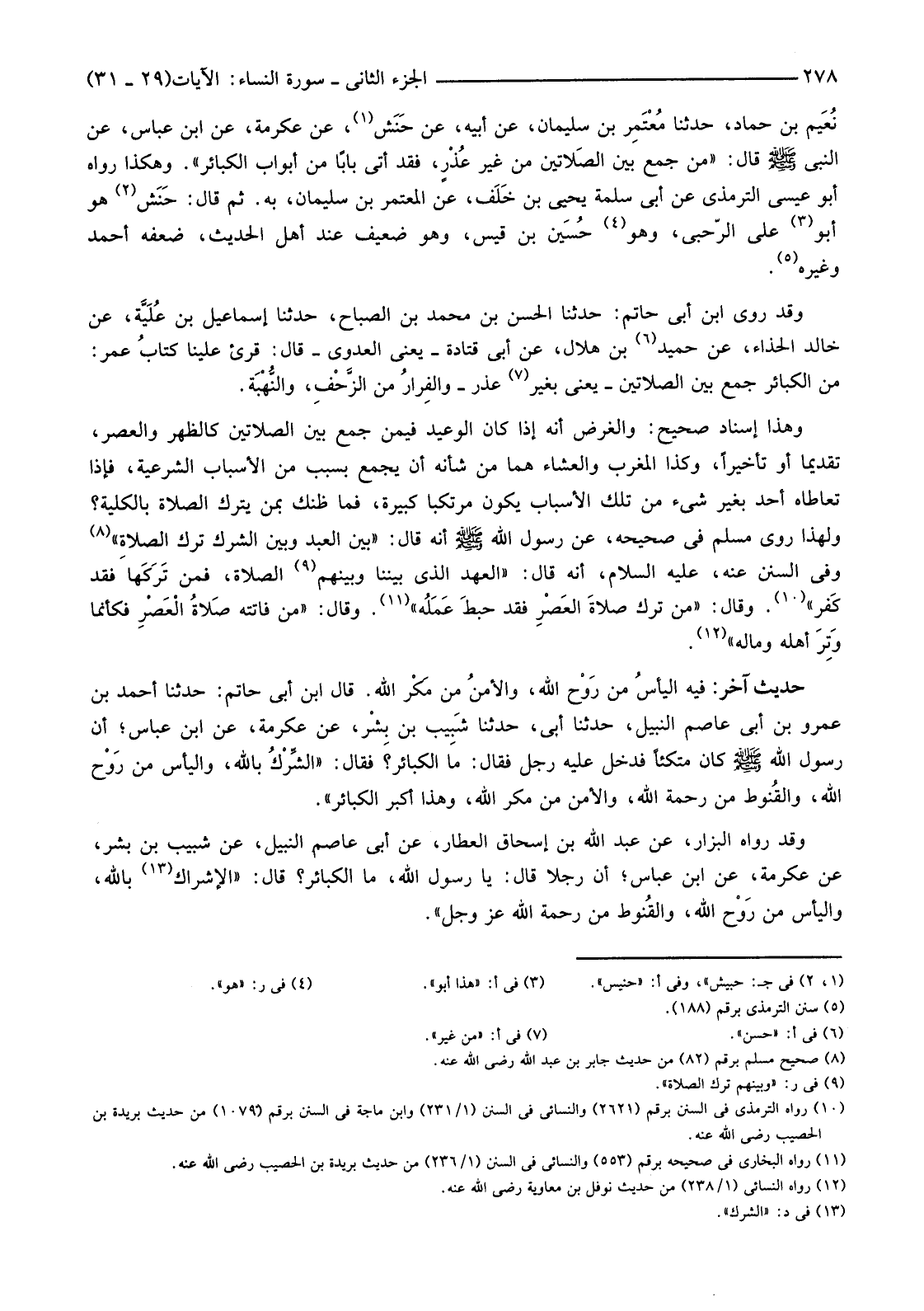 وَهَذَا إِسْنَادٌ صَحِيحٌ: وَالْغَرَضُ أَنَّهُ إِذَا كَانَ الْوَعِيدُ فِيمَنْ جَمَعَ بَيْنَ الصَّلَاتَيْنِ كَالظُّهْرِ وَالْعَصْرِ تَقْدِيمًا أَوْ تَأْخِيرًا، وَكَذَا الْمَغْرِبُ وَالْعَشَاءُ هُمَا مِنْ شَأْنِهِ أَنْ يَجْمَعَ بِسَبَبٍ مِنَ الْأَسْبَابِ الشَّرْعِيَّةِ، فَإِذَا تَعَاطَاهُ أَحَدٌ بِغَيْرِ شَيْءٍ مِنْ تِلْكَ الْأَسْبَابِ يَكُونُ مُرْتَكِبًا كَبِيرَةً، فَمَا ظَنُّكَ بِمَنْ تَرَكَ الصلاةِ بِالْكُلِّيَّةِ؟ وَلِهَذَا رَوَى مُسْلِمٌ فِي صَحِيحِهِ، عَنْ رَسُولِ اللَّهِ صَلَّى اللَّهُ عَلَيْهِ وَسَلَّمَ أَنَّهُ قَالَ: "بَيْنَ الْعَبْدِ وَبَيْنَ الشِّرْكِ تَرْكُ الصَّلَاةِ " (8) وَفِي السُّنَنِ عَنْهُ، عَلَيْهِ السَّلَامُ، أَنَّهُ قَالَ: "الْعَهْدُ الَّذِي بَيْنَنَا وَبَيْنَهُمُ (9) الصَّلَاةُ، فَمَنْ تَرَكَها فَقَدْ كَفر" (10) وَقَالَ: "مَنْ تَرَكَ صلاةَ العَصْرِ فَقَدْ حبطَ عَمَلُه" (11) وَقَالَ: "مَنْ فَاتَتْهُ صَلاةُ الْعَصْرِ فَكَأَنَّمَا وَتِرَ أَهْلَهُ وَمَالَهُ" (12) .