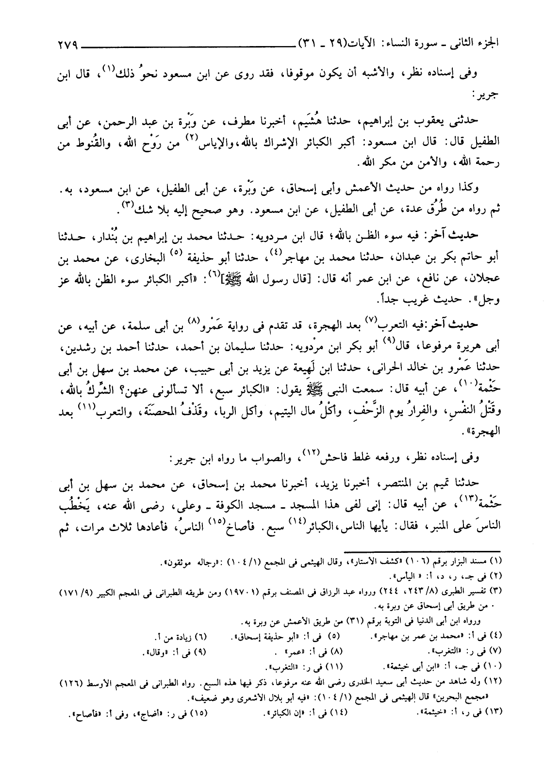 وَفِي إِسْنَادِهِ نَظَرٌ، وَرَفْعُهُ غَلَطٌ فَاحِشٌ (12) وَالصَّوَابُ مَا رَوَاهُ ابْنُ جَرِيرٍ: حَدَّثَنَا تَمِيمُ بْنُ الْمُنْتَصِرِ، أَخْبَرَنَا يَزِيدُ، أَخْبَرَنَا مُحَمَّدُ بْنُ إِسْحَاقَ، عَنْ مُحَمَّدِ بْنِ سُهَيْلِ بْنِ أَبِي حثْمة (13) عَنْ أَبِيهِ قَالَ: إِنِّي لَفِي هَذَا الْمَسْجِدِ -مَسْجِدِ الْكُوفَةِ-وَعَلِيٌّ، رَضِيَ اللَّهُ عَنْهُ، يَخْطُب الناسَ عَلَى الْمِنْبَرِ، فَقَالَ: يَا أَيُّهَا النَّاسُ، الْكَبَائِرُ (14) سَبْعٌ فَأَصَاخَ (15) الناسُ، فَأَعَادَهَا ثَلَاثَ مَرَّاتٍ، ثُمَّ
