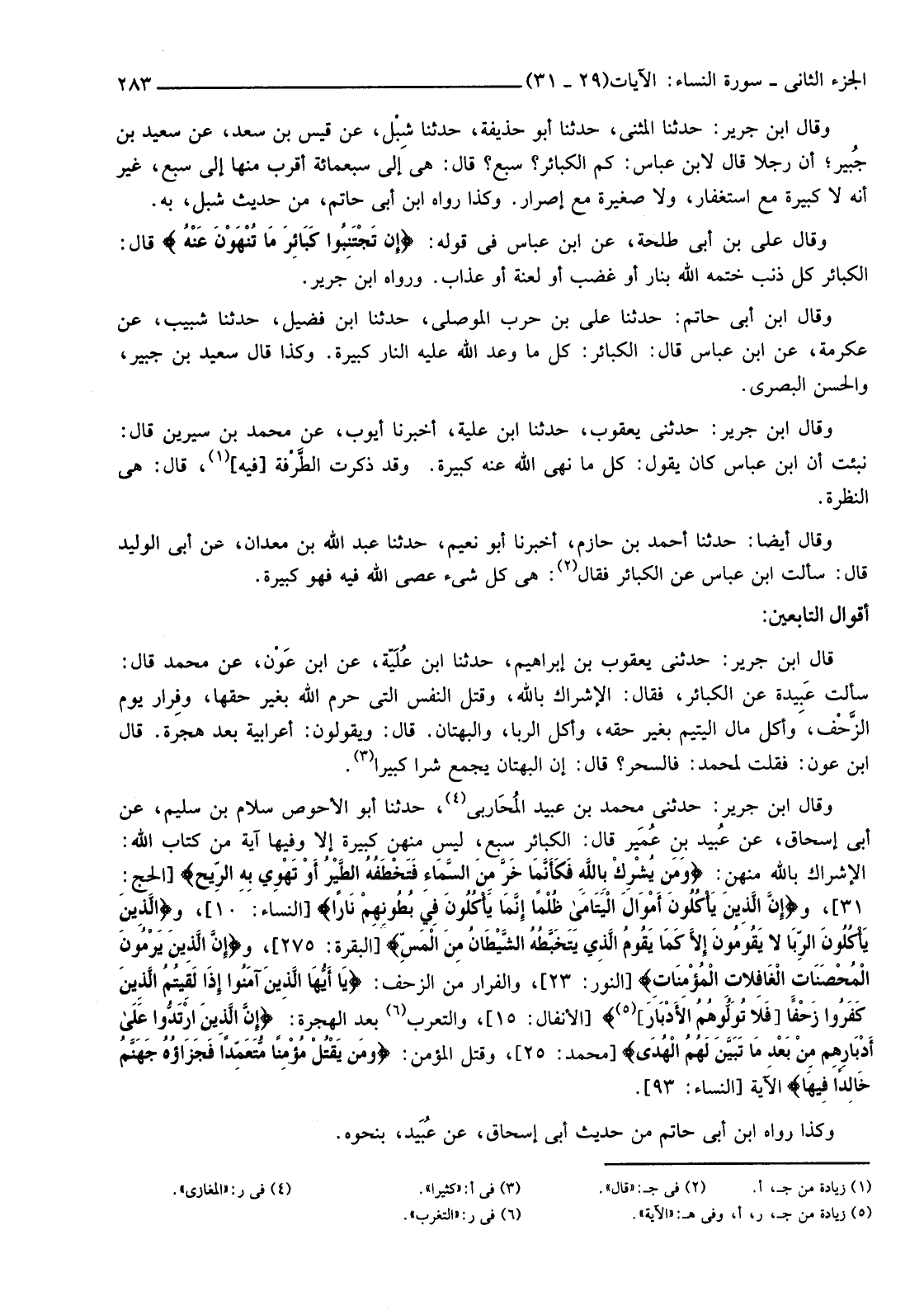 قَالَ ابْنُ جَرِيرٍ: حَدَّثَنِي يَعْقُوبُ بْنُ إِبْرَاهِيمَ، حَدَّثَنَا ابْنُ عُلَيّة، عَنِ ابْنِ عَوْن، عَنْ مُحَمَّدٍ قَالَ: سَأَلَتْ عَبِيدة عَنِ الْكَبَائِرِ، فَقَالَ: الْإِشْرَاكُ بِاللَّهِ، وَقَتْلُ النَّفْسِ الَّتِي حَرَّمَ اللَّهُ بِغَيْرِ حَقِّهَا، وَفِرَارُ يَوْمِ الزَّحْف، وَأَكْلُ مَالِ الْيَتِيمِ بِغَيْرِ حَقِّهِ، وَأَكْلُ الرِّبَا، وَالْبُهْتَانُ. قَالَ: وَيَقُولُونَ: أَعْرَابِيَّةٌ بَعْدَ هِجْرَةٍ. قَالَ ابْنُ عَوْنٍ: فَقُلْتُ لِمُحَمَّدٍ: فَالسِّحْرُ؟ قَالَ: إِنَّ الْبُهْتَانَ يَجْمَعُ شَرًّا كَبِيرًا (3) .