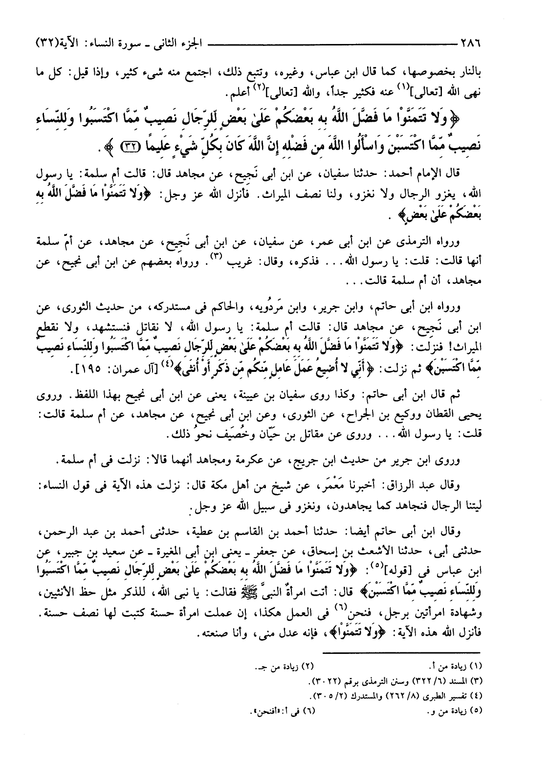 وَرَوَاهُ ابْنُ أَبِي حَاتِمٍ، وَابْنُ جَرِيرٍ وَابْنُ مَرْدُويه، وَالْحَاكِمُ فِي مُسْتَدْرَكِهِ، مِنْ حَدِيثِ الثَّوْرِيُّ، عَنِ ابْنِ أَبِي نَجِيحٍ، عَنْ مُجَاهِدٍ قَالَ: قَالَتْ أُمُّ سَلَمَةَ: يَا رَسُولَ اللَّهِ، لَا نُقَاتِلُ فَنُسْتَشْهَدُ، وَلَا نُقْطَعُ الْمِيرَاثَ! فَنَزَلَتْ: {وَلا تَتَمَنَّوْا مَا فَضَّلَ اللَّهُ بِهِ بَعْضَكُمْ عَلَى بَعْضٍ لِلرِّجَالِ نَصِيبٌ مِمَّا اكْتَسَبُوا وَلِلنِّسَاءِ نَصِيبٌ مِمَّا اكْتَسَبْنَ} ثُمَّ نَزَلَتْ: {أَنِّي لَا أُضِيعُ عَمَلَ عَامِلٍ مِنْكُمْ مِنْ ذَكَرٍ أَوْ أُنْثَى} (4) [آلِ عِمْرَانَ: 195] .